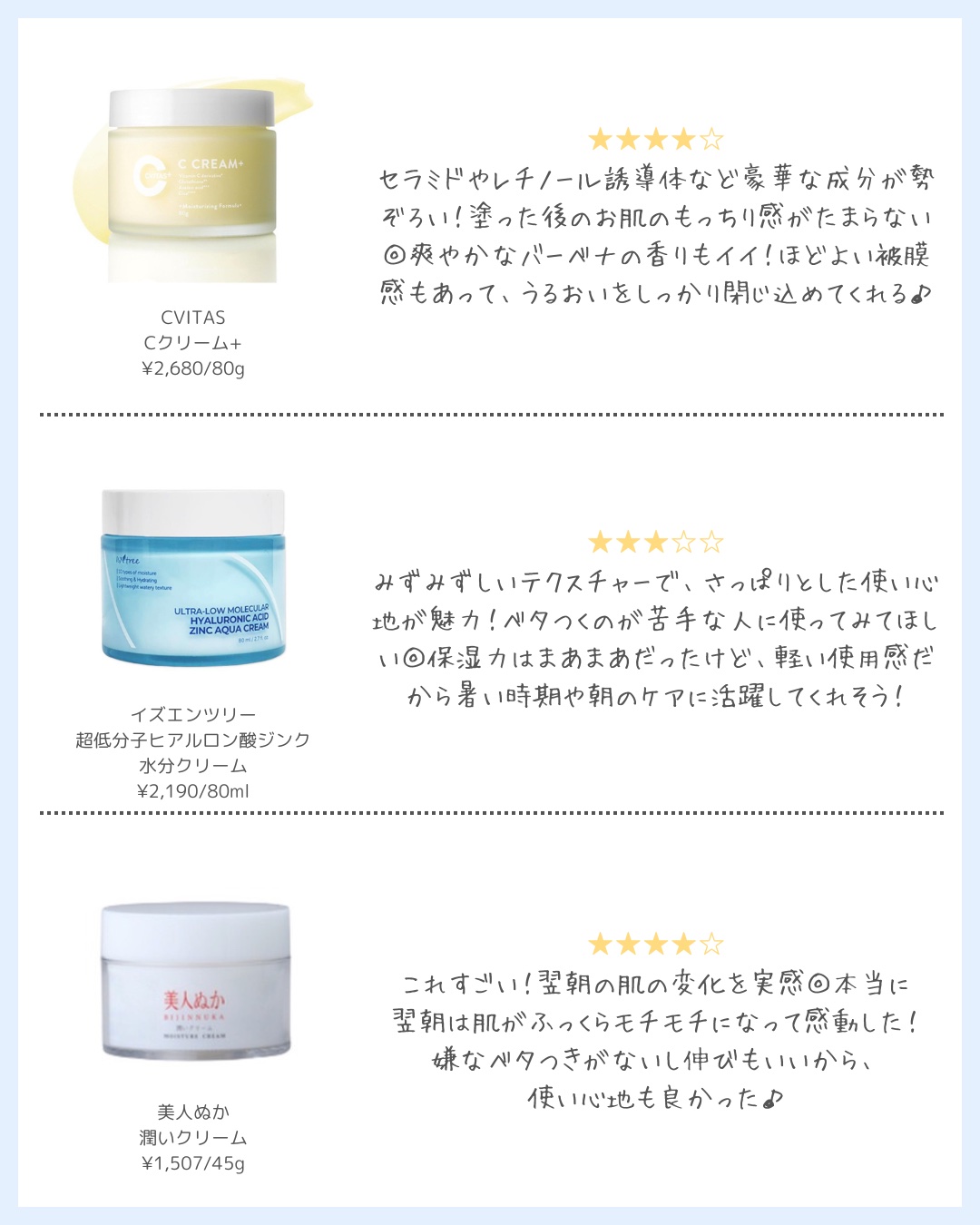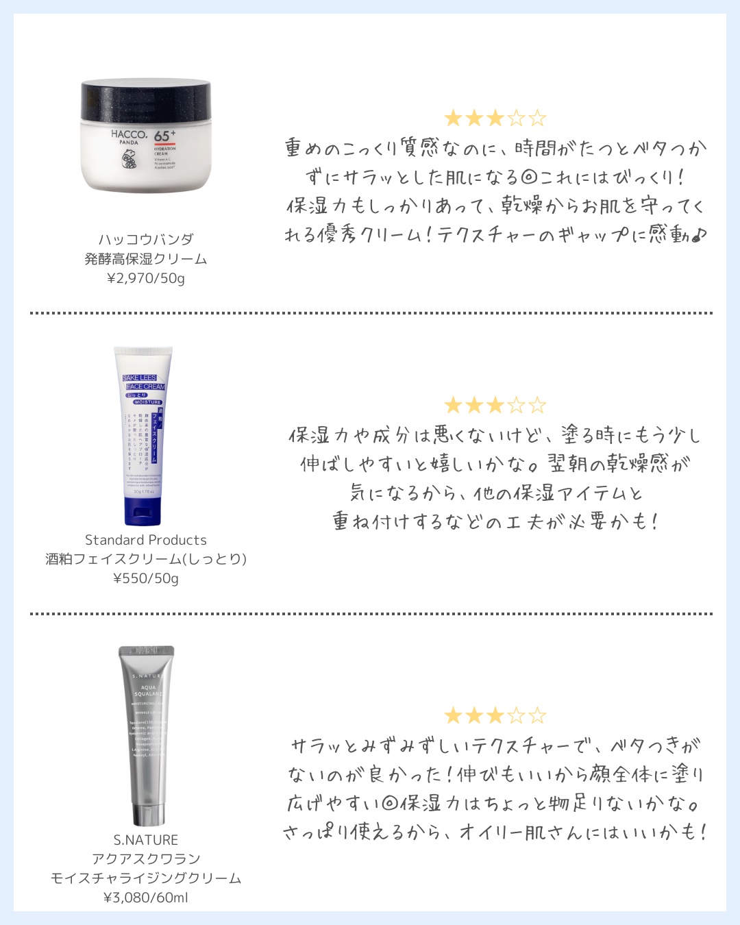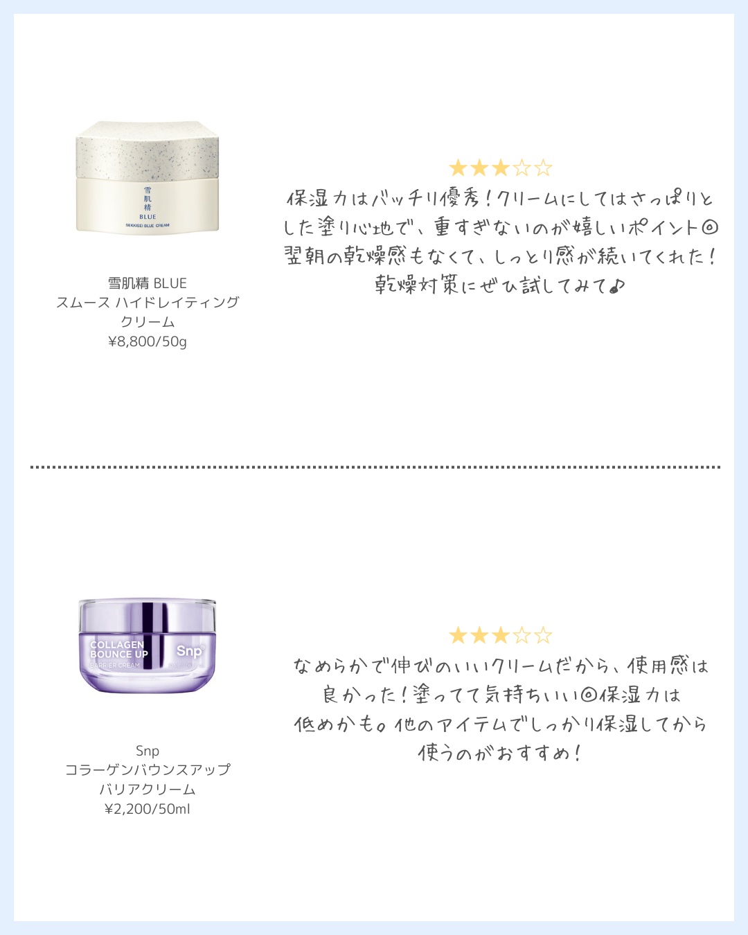 | 軽めの使い心地でさっぱりしつつも保湿は出来るような水分クリーム探してる方には特にオススメです! | 詳細を見る | ||