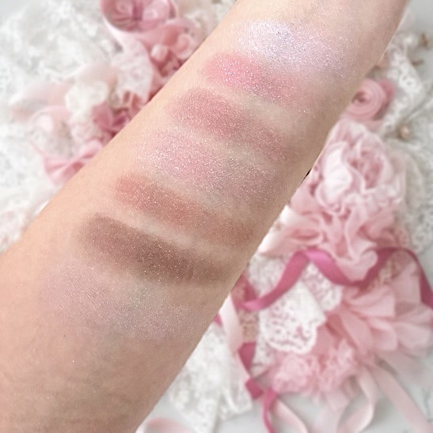 やっぱり可愛い…! 思ったよりコンパクトなサイズ感のアイシャドウパレットでした! このパレット全カラー使いやすい!! アイシャドウパレットのブラウンカラーは2色とも柔らかい発色なので使いやすい♡ そしてパールシマーのラメ感が可愛すぎる♡ 全体的に淡く柔らかい発色なのでとくにナチュラルメイクが好きな方におすすめしたい 𓂃 𓈒𓏸