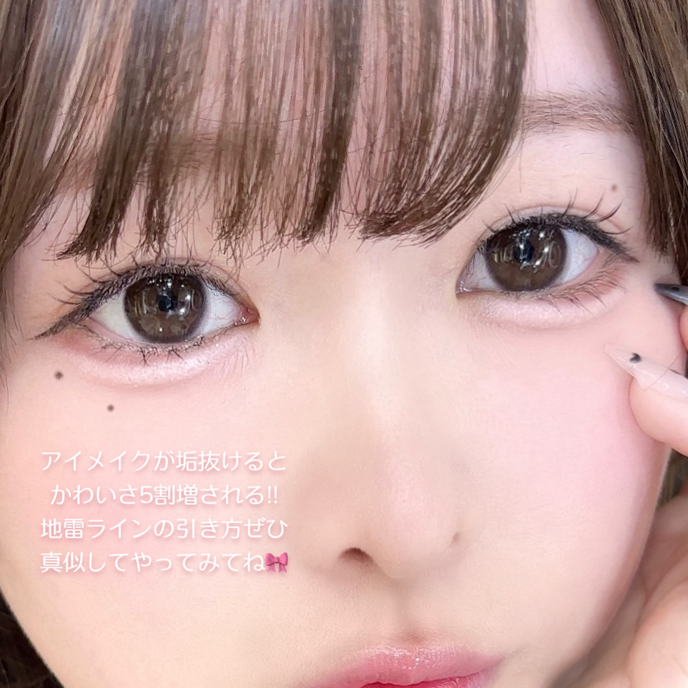 下まぶたにラインを引くことによって中顔面短縮になるし、少し赤みのあるカラーだから目元が暗くならずに目が大きく見える✌🏻 個人的に1番こだわってるのが涙袋の描き方で目頭狭めに描き始めて、目尻にかけて幅を広くするとナチュラルなタレ目になるからおすすめです🫶🏻 パーフェクトダイアリーのラメはちょうど良い大きさのラメで使いやすく、瞬きする度にチラチラ輝いて目を開けてても閉じてても可愛いアイメイクが叶う👑