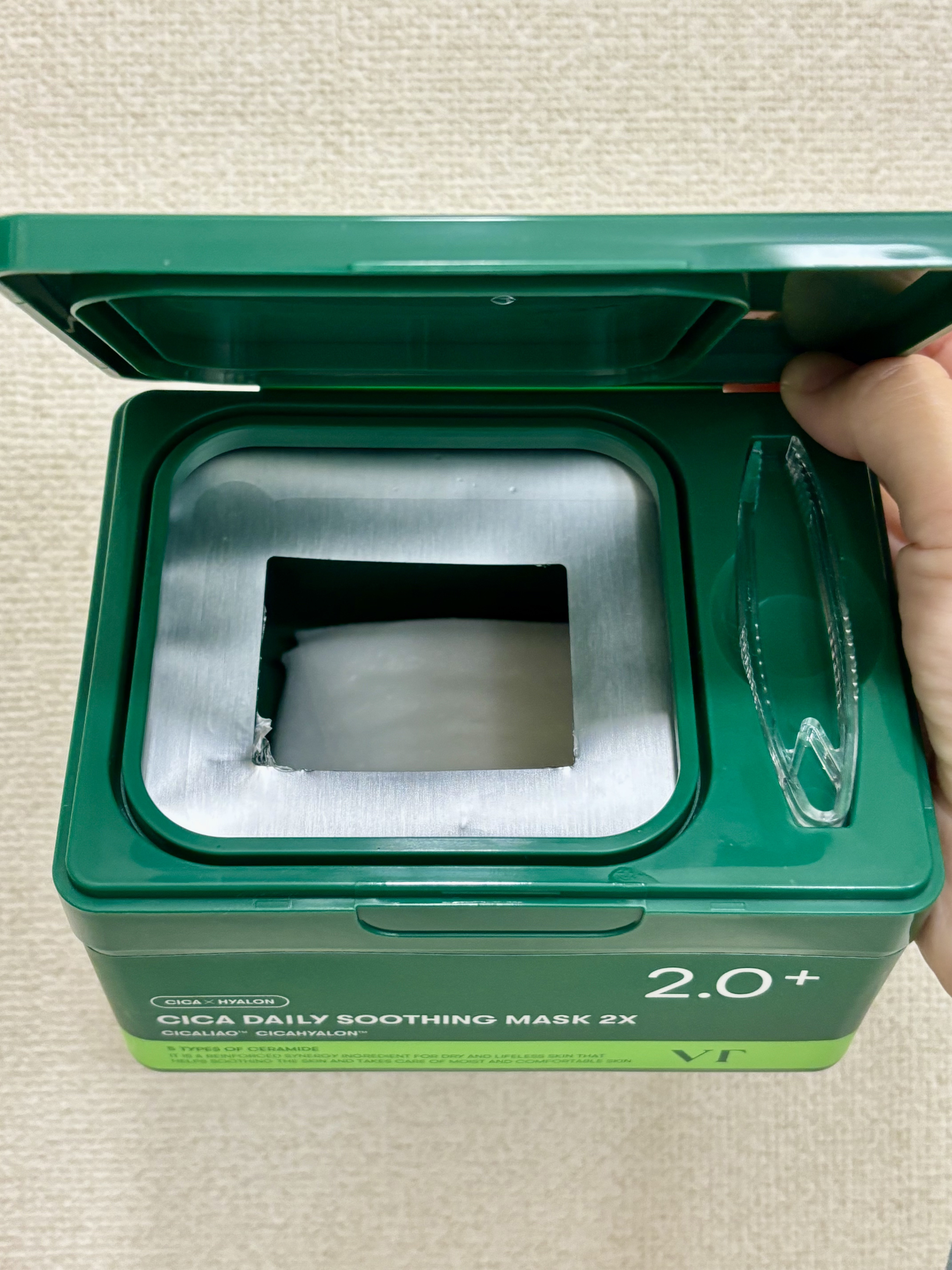 - 【デイリースージングマスクのアップグレード】 シカヒアルロン™*1を2倍配合*2でゆらぎケア。 2025年上半期の時点で累計1,841万箱売り上げたVTといえばの緑のCICA デイリースージングマスク! それのCICA成分*1が2倍になったリニューアルバージョンが登場です。 CICA成分*2だけじゃなく、アラントイン*3やセラミド*3も配合でゆらぎやすい肌の人により使いやすい使用になりました。 シートもより厚みがあり柔らかく密着するので、今までのCICAマスクファンの方へ是非お試し頂きたいです。 【追加美容成分】 5種類のセラミド*3が肌に潤いをあたえ、 アラントイン*3が肌コンディションを整え、 パンテノール*3も配合で、乾燥外部刺激を受けた肌を健やかな肌に保ちます。 ■使い方 洗顔後、化粧水で肌を整えた後、蓋を開けてミニピンセットで1枚取り出します。 シートマスクを顔に均等に密着させ10分後にはがし、残りの美容液はてのひら全体で優しくなじませます。 ■このような方へおすすめ ゆらぎ肌をケアしたい方 外部刺激を受けた肌にCICA成分でケアしたい方 さっぱり潤いのある保湿ケアが必要な方 スキンケアを簡単に終わらせたい方 *1整肌成分 : ツボクサエキス、マデカッソシド、マデカシン酸、アシアチコシド、アシアチン酸/保湿成分 : プロポリスエキス、ヒアルロン酸Na/溶剤 : 水、 1,2-ヘキサンジオール *2CICA デイリースージングマスク比 *3保湿成分