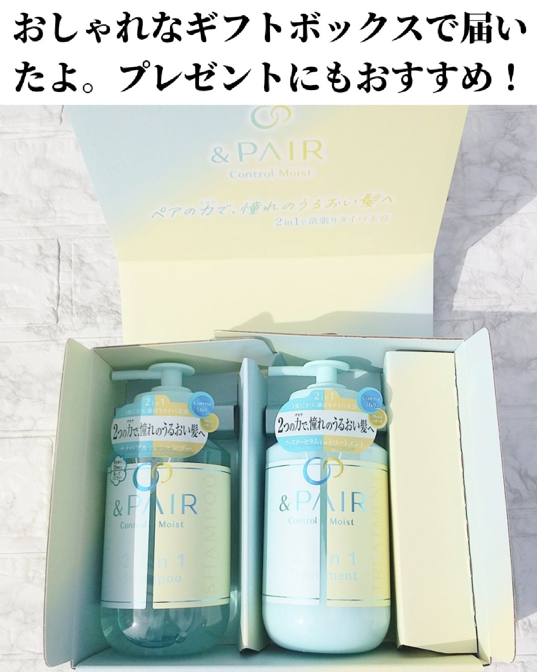 - &PAIRは「タイパ美容」に着目し、1本で2つの機能を持ち合わせたヘアケアブランドです。 コントロール モイストシリーズはうねり※1とパサつきを同時にケアし、しっとりな仕上がりに導きます。 シャンプーにはナノバブルパーツが採用されており、本体を振ることでナノバブルを発生させることができます。 ナノサイズの微細な泡で毛穴の皮脂汚れを滑らかに洗い流します。 ヘアトリートメントは導入ブースター成分*1で保湿成分の浸透をサポートし、 髪のパサつきに浸透保湿ケアができる導入ブースター機能のあるヘアトリートメント。 製品の90%以上が保湿&うねり※1ケア成分*2で構成し※2、指通り滑らかなしっとり髪へ導きます。 石油系洗浄成分不使用・パラベン不使用・動物実験不実施(製品として)・合成着色料不使用・サルフェート不使用(ラウレス硫酸Na)・鉱物油不使用 ※1 乾燥により髪のしなやかさが不足し、まとまりにくい状態 ※2 基剤を除く、水を含む *1 アルギニン、加水分解ケラチン(羊毛)、加水分解ヒアルロン酸(全て保湿) *2 γードコサラクトン(補修)