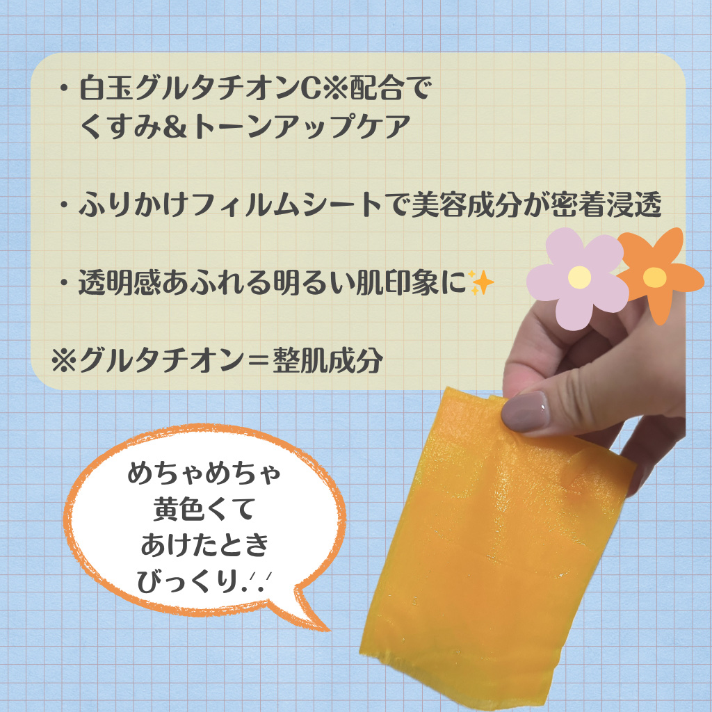 - ※2025年8月以降、商品パッケージ順次リニューアル。尚、これにかかる商品の返品・交換は承っておりません。 顔全面に隙間なく照明ON!ビタミンC*1をふりかけた黄色いシートに高濃縮グルタチオンC*1美容液を入れ込んだ、くすみ*2集中ケアシートマスク *1整肌成分 *2乾燥によるもの
