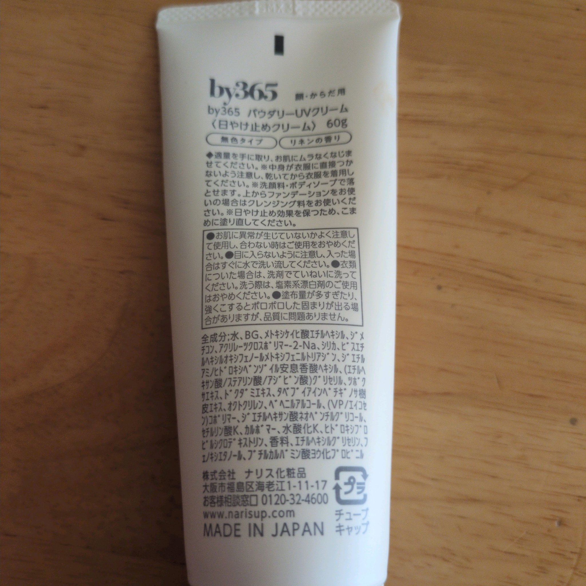 お店のテスターを使ってみて、ベタベタしない!めちゃめちゃサラサラ~と思い買いました。夏場は汗かくのでこのくらいでないと!2種類あって★by365パウダリーUVクリーム(ベージュパケ)ノーカラータイプ香りはリネンの香りで、きつくないし残らない。...