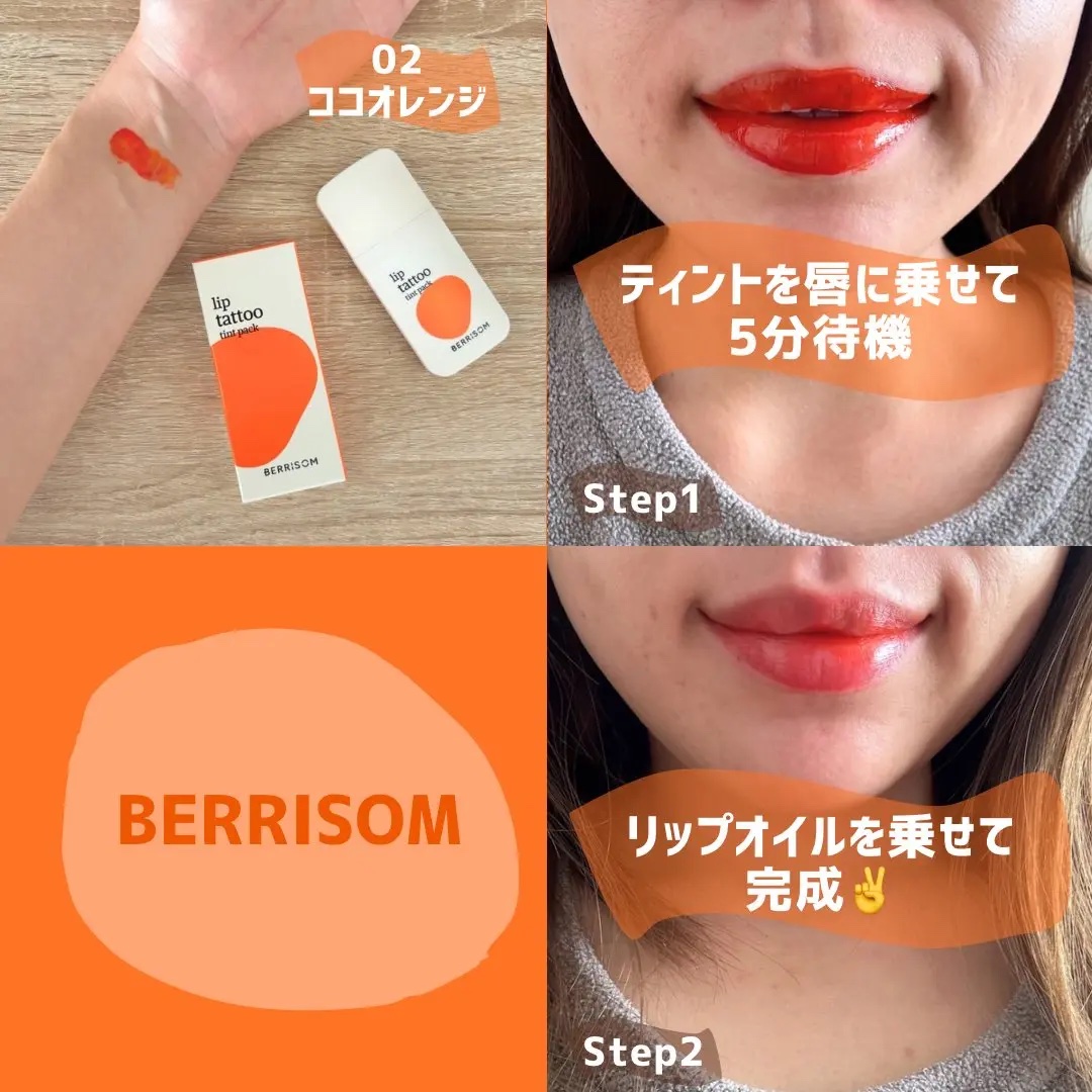 貼って剥がすだけで色付くBERRISOM(ベリサム)のリップタトゥーティント♡短時間でOKだし、ウォータープルーフで落ちにくいのでめちゃくちゃ便利!02ココオレンジはイエベカラー!最後にリップオイルで仕上げると◎#PR#BERRISOM#ベリ...