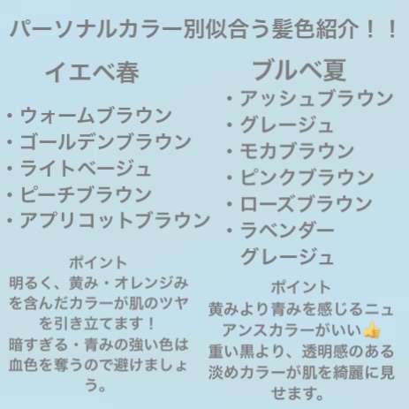 明るくて柔らかい印象を与えるベージュ系の髪色がおすすめ♡ カラーを入れる場合はピンクやオレンジなどの暖色を合わせると雰囲気とマッチしやすい! ヘルシーで活発な印象を与えるアッシュ系の髪色がおすすめ♡ カラーを入れる場合はオリーブ・ハイライトやインナーなど遊び心を加えるのも雰囲気とマッチしやすい! ふんわり柔らかい印象を与えるブラウン系の髪色がおすすめ♡ カラーを入れる場合はピンクやパープルなど甘い色味と合わせると雰囲気とマッチしやすい! クールで知的な印象を与えるダークトーンの髪色がおすすめ♡ カラーを入れる場合はグレーやブルーなどの寒色を合わせると雰囲気とマッチしやすい!