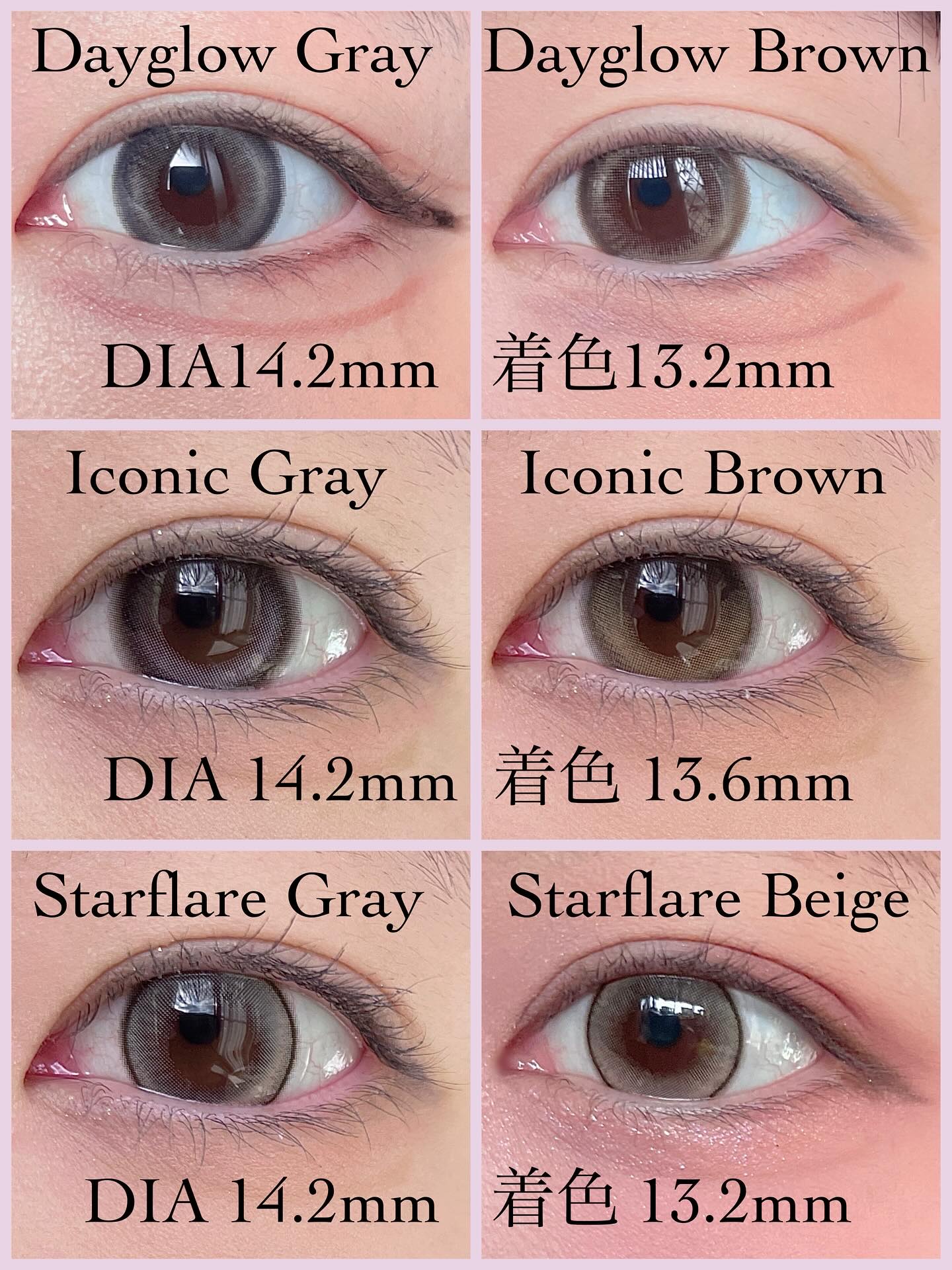 - ガラス玉に閉じ込めた無数のきらめきが、あなたの瞳で自信に変わる。 回っても、ずれても、輝きが続く”ガラス玉レンズ”。 <アイコニックグレー > 水面に揺れる光のようなきらめきで印象的な瞳を叶えます。 瞳の輪郭を優しく縁取る太フチに、象徴的な半月ハイライトが瞳に上品な立体感を与えます。 <アイコニックブラウン > 水面に揺れる光のようなきらめきで印象的な瞳を叶えます。 瞳の輪郭を優しく縁取る太フチに、象徴的な半月ハイライトが瞳に上品な立体感を与えます。 <スターフレアグレー > 降り注ぐ星屑のようなハイライトデザインが、ドラマティックな輝きを与えます。 視線を奪うくっきりとした細フチに、繊細に重なり合うハイライトが主役級の輝きをプラスします。 <スターフレアベージュ > 降り注ぐ星屑のようなハイライトデザインが、ドラマティックな輝きを与えます。 視線を奪うくっきりとした細フチに、繊細に重なり合うハイライトが主役級の輝きをプラスします。 <デイグローグレー> 光をふわりと滲ませるグローカラーが、瞳にヘルシーな艶を仕込みます。 ナチュラルに滲むようなぼかしフチでくりっとした立体感を演出し、内側のグロウカラーが、瞳に光沢感をプラスします。 <デイグローブラウン > 光をふわりと滲ませるグローカラーが、瞳にヘルシーな艶を仕込みます。 ナチュラルに滲むようなぼかしフチでくりっとした立体感を演出し、内側のグロウカラーが、瞳に光沢感をプラスします。 カラーコンタクトレンズの不適正使用による眼障害の危険性等などがあります。 ●コンタクトレンズは高度管理医療機器です。不十分な洗浄・消毒など不適切なケアや、長時間・交換期間を超えた装用により、アレルギー性結膜炎、角膜感染症、角膜潰瘍等の重篤な眼障害が発生する危険性があります ●ご使用前に取扱説明書を確認してください 使用上の留意事項 ●眼科医院等を受診してからお求めください ●眼に異常を感じたら直ちにレンズ使用を中止し、お近くの眼科等で診察を受けてください ●医師の指示にしたがってご使用ください ●コンタクトレンズを装用する場合、自覚症状がなくても、眼科医院等での定期検査を受けてください ●レンズに不具合がある場合は使用しないでください
