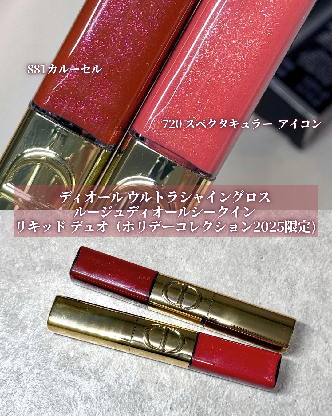 DIORのホリデー限定色公式サイト購入品レビュールージュディオールシークインリキッドデュオホリデー限定色719アクロバット(ディオール公式オンライン限定)赤みのあるブラウンがめちゃくちゃ可愛いです!オンラインで見た写真だと結構濃い色に見えまし...
