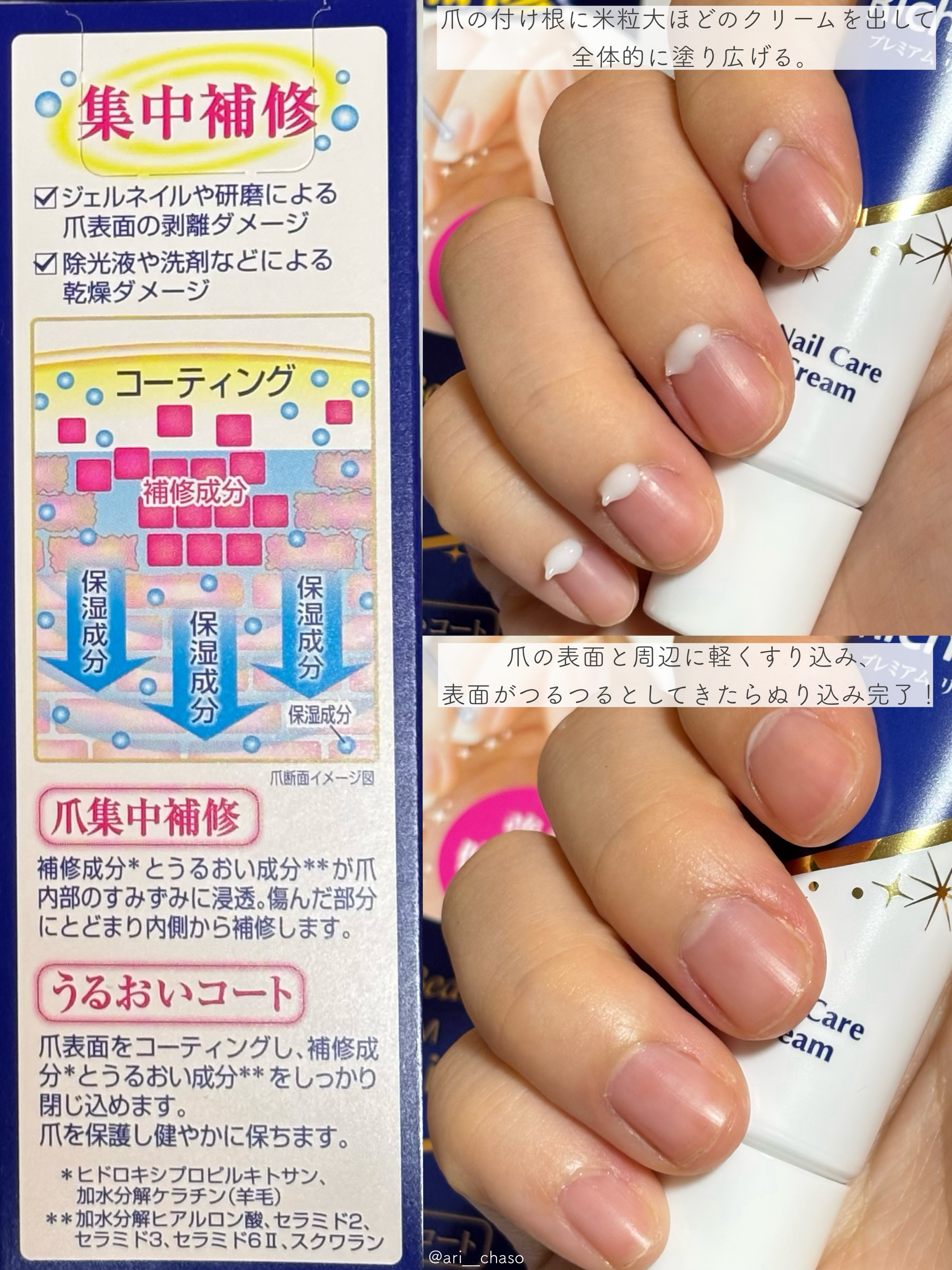- 「メンソレータム ハンドベール ビューティー プレミアムリッチネイル」は、爪を保護し、すこやかに保つ爪集中補修クリームです。爪が欠けやすい人や爪の乾燥が気になる人、二枚爪の人などにおすすめです。ジェルネイルや研磨によりダメージを受けた爪表面を補修し、除光液や洗剤などにより乾燥した爪周りを保湿。強く美しい健康的な爪へ導きます。