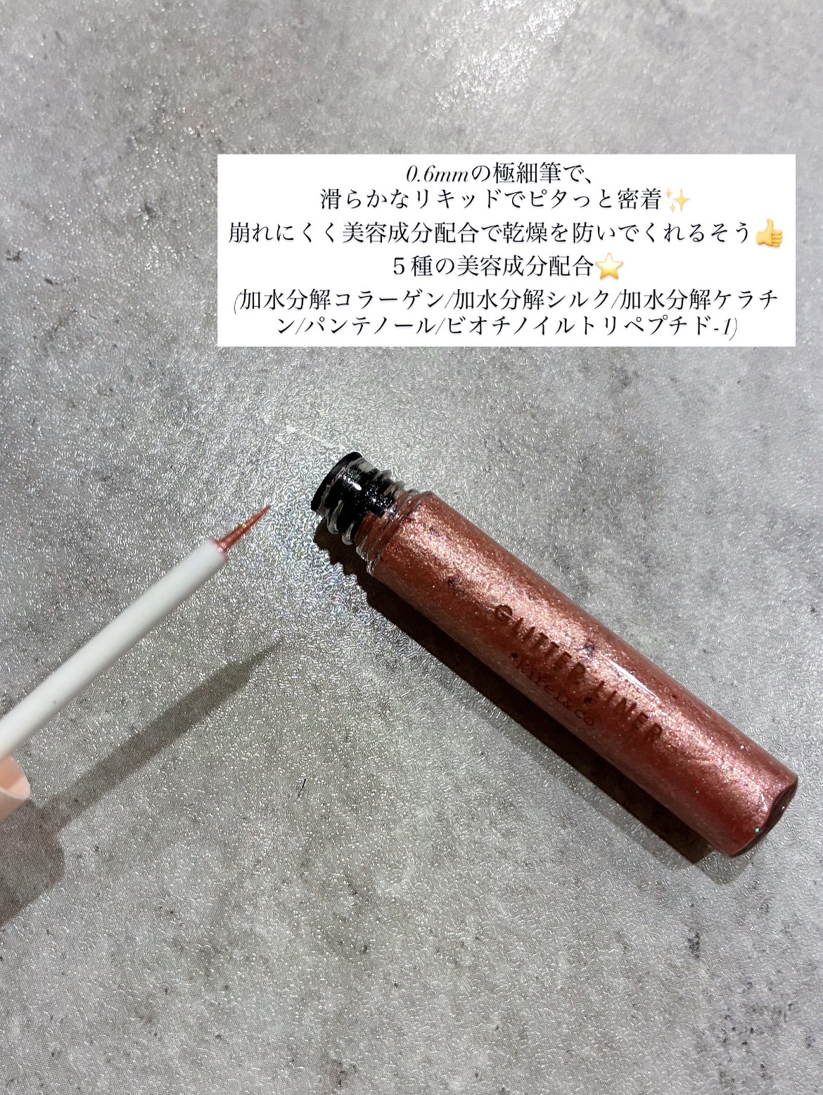 - 5種の美容液成分(保湿成分)配合。0.6mmの極細筆採用。ラメが落ちにくく、ヨレにくい。