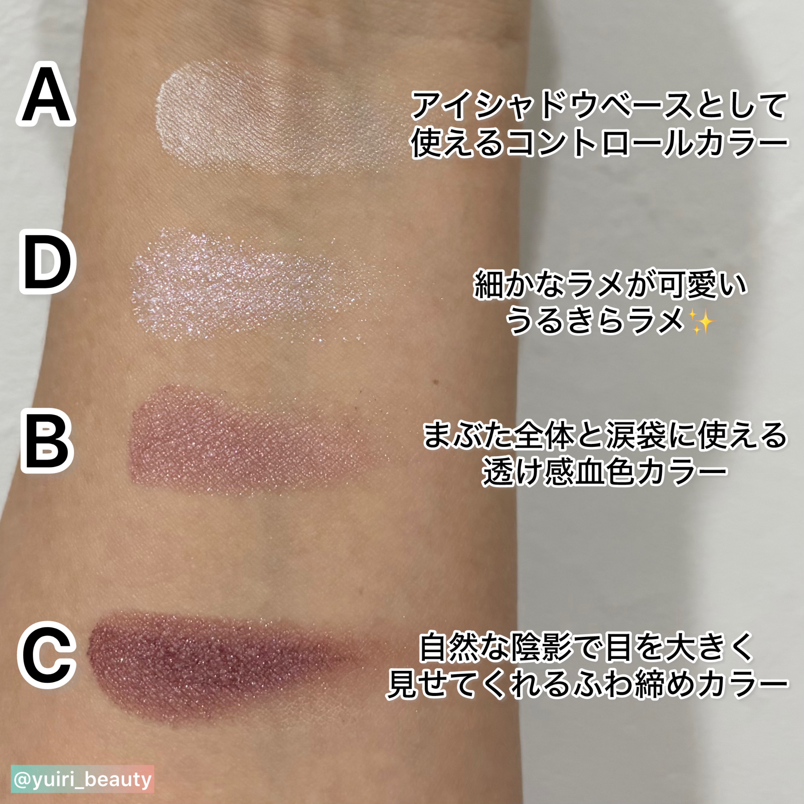 - 粘膜拡張カラーでうるちゅる目もとに 理想の顔に整えるアイカラーパレット 血色感を仕込んだ「粘膜拡張」カラーが大きな目もとを演出 ◇透け感のある血色カラーが粘膜を拡張し、涙袋をぷっくりとみせ、ナチュラルで大きな目もとに仕上げます。 透明感と高発色を両立した色設計 ◇にごりにくく自然なグラデーションを作る色設計で、透明感のある目もとを演出。 ◇さらに、しっとりと密着する高発色処方で、透明感と高発色の両立を実現します。 光を操る “うるきら”ラメで 、ちゅるんとした目もとに ◇うるうる&きらきらに輝くガラスパール配合で、目頭や上まぶた、涙袋などに光を集め、ちゅるんとうるんだ目もとを演出。 異なる質感と処方で、簡単に大きな目もとに仕上げるパレット設計 ◇異なる質感・処方が特徴の4色<コントロールカラー>・<透け感血色カラー>・<ふわ締めカラー>・<うるきらラメ>が入ったパレット。 ◇アイカラーベースの効果やしっとり高密着な処方により、ヨレを防ぎ、塗りたての美しい仕上がりを長時間キープします。