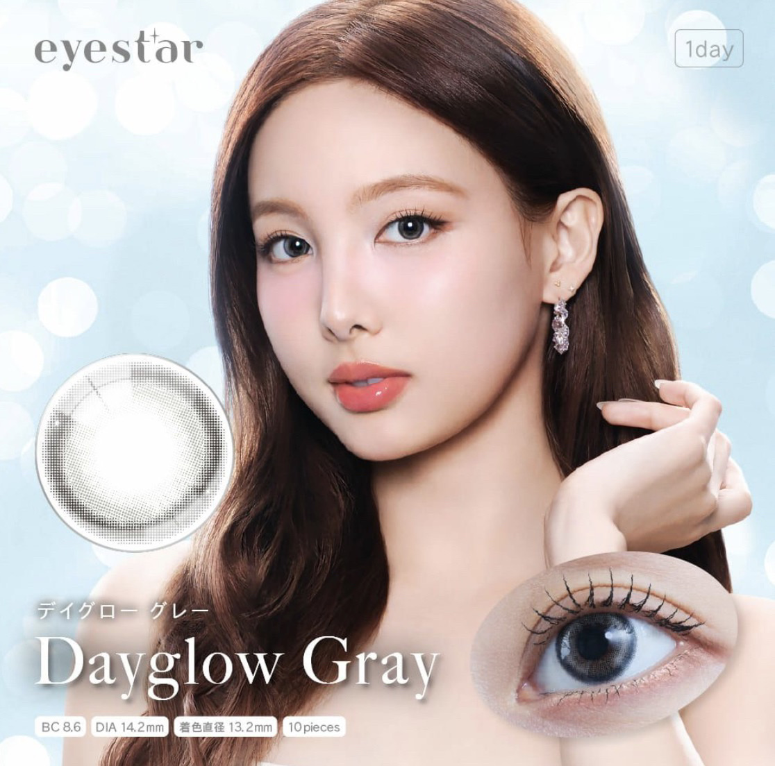 - ガラス玉に閉じ込めた無数のきらめきが、あなたの瞳で自信に変わる。 回っても、ずれても、輝きが続く”ガラス玉レンズ”。 <アイコニックグレー > 水面に揺れる光のようなきらめきで印象的な瞳を叶えます。 瞳の輪郭を優しく縁取る太フチに、象徴的な半月ハイライトが瞳に上品な立体感を与えます。 <アイコニックブラウン > 水面に揺れる光のようなきらめきで印象的な瞳を叶えます。 瞳の輪郭を優しく縁取る太フチに、象徴的な半月ハイライトが瞳に上品な立体感を与えます。 <スターフレアグレー > 降り注ぐ星屑のようなハイライトデザインが、ドラマティックな輝きを与えます。 視線を奪うくっきりとした細フチに、繊細に重なり合うハイライトが主役級の輝きをプラスします。 <スターフレアベージュ > 降り注ぐ星屑のようなハイライトデザインが、ドラマティックな輝きを与えます。 視線を奪うくっきりとした細フチに、繊細に重なり合うハイライトが主役級の輝きをプラスします。 <デイグローグレー> 光をふわりと滲ませるグローカラーが、瞳にヘルシーな艶を仕込みます。 ナチュラルに滲むようなぼかしフチでくりっとした立体感を演出し、内側のグロウカラーが、瞳に光沢感をプラスします。 <デイグローブラウン > 光をふわりと滲ませるグローカラーが、瞳にヘルシーな艶を仕込みます。 ナチュラルに滲むようなぼかしフチでくりっとした立体感を演出し、内側のグロウカラーが、瞳に光沢感をプラスします。 カラーコンタクトレンズの不適正使用による眼障害の危険性等などがあります。 ●コンタクトレンズは高度管理医療機器です。不十分な洗浄・消毒など不適切なケアや、長時間・交換期間を超えた装用により、アレルギー性結膜炎、角膜感染症、角膜潰瘍等の重篤な眼障害が発生する危険性があります ●ご使用前に取扱説明書を確認してください 使用上の留意事項 ●眼科医院等を受診してからお求めください ●眼に異常を感じたら直ちにレンズ使用を中止し、お近くの眼科等で診察を受けてください ●医師の指示にしたがってご使用ください ●コンタクトレンズを装用する場合、自覚症状がなくても、眼科医院等での定期検査を受けてください ●レンズに不具合がある場合は使用しないでください