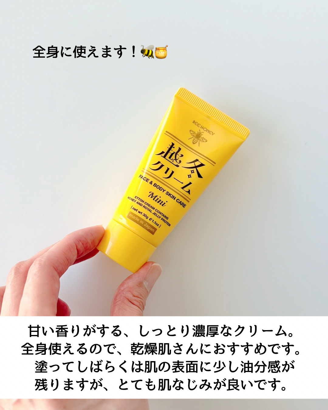 毎年期間限定で発売されているリップ。今年は特に唇の乾燥が気になるので、購入してみました。 はちみつの優しい良い香りがします。リップクリームは固めの印象。 ハチミツやミツロウ、ローヤルゼリー(保湿成分)などみつばちの恵みと-40℃で生きるクラウドベリーの種子油(ホロムイイチゴ種子油)(保湿成分)などの植物の恵みを詰め込み、冬の乾燥から唇を守ります。