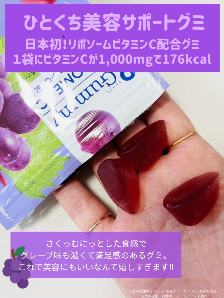 - 「食べるリポソームビタミンC」登場。2Gummyは、話題のリポソームビタミンCを配合したグミ。量と頻度に着目し、1袋にビタミンCを1,000mg配合。おやつ感覚で、いつでもどこでもビタミンCをチャージできます。