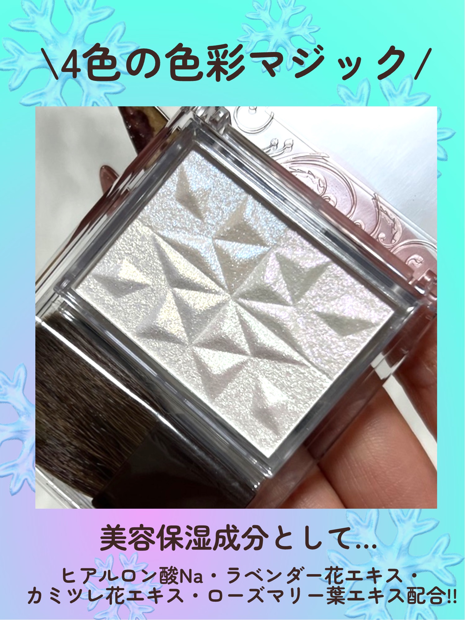- まるで塗るレフ板。濡れツヤ感ハイライトの限定色。 全色混ぜて使うのはもちろん、単色でも使える今だけの特別な4色入りハイライト。角度によって表情を変える輝きをまとって気分も上向きに。 美容保湿成分(ヒアルロン酸Na・ラベンダー花エキス・カミツレ花エキス・ローズマリー葉エキス)配合。 肌あたりの良い毛量たっぷりのブラシ付。