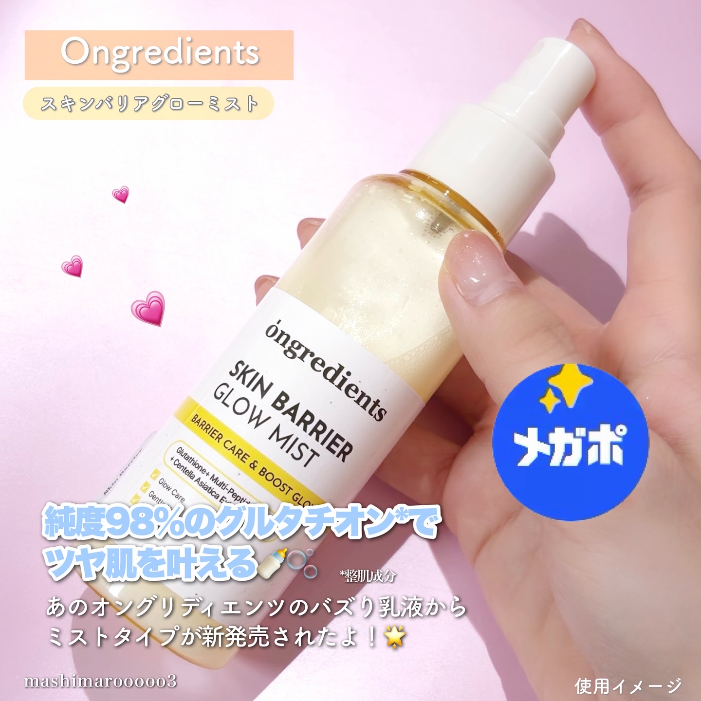- 「ongredients(オングリディエンツ)」が、ついに日本のオフライン店舗に登場! <2025年8月30日(土)(※1)より全国のプラザ、ドン・キホーテ(※2)にて先行販売を開始> 水光トナーと水分グロウ成分が融合し、まるでハイライトを施したようなツヤ肌ミストを実現 【主要成分】 ・ツボクサ葉エキス(※3) 外的刺激を受けた肌を落ち着かせ、肌バリア(※4)機能を守ります。 ・複合ペプチド(※5) 肌のコンディションを整え、ハリのある肌印象へと導きます。 ・ヒアルロン酸(※6)&パンテノール(※7) 乾燥した肌を保湿ししっとり健やかに整えます。 【こんな方におすすめ】 ・外的刺激による肌のゆらぎが気になる方 ・保湿とキメのダブルケアをしたい方 ・\メイクの上からでも!/外出先でも、肌にうるおいを与えたい方 (※1)店頭開始日となり、購入可能日は各店舗により異なります。 (※2)一部店舗を除きます。 (※3)鎮静成分 (※4)角質層のうるおいを保つこと (※5)トリペプチド-1銅,トリペプチド-1,パルミトイルトリペプチド-1,パルミトイルペンタペプチド-4,ヘキサペプチド-11,ヘキサペプチド-9 (※6)ヒアルロン酸Na,ヒアルロン酸クロスポリマーNa,ヒアルロン酸K,ヒアルロン酸ヒドロキシプロピルトリモニウム,加水分解ヒアルロン酸Na,加水分解ヒアルロン酸,ヒアルロン酸(保湿成分) (※7)保湿成分
