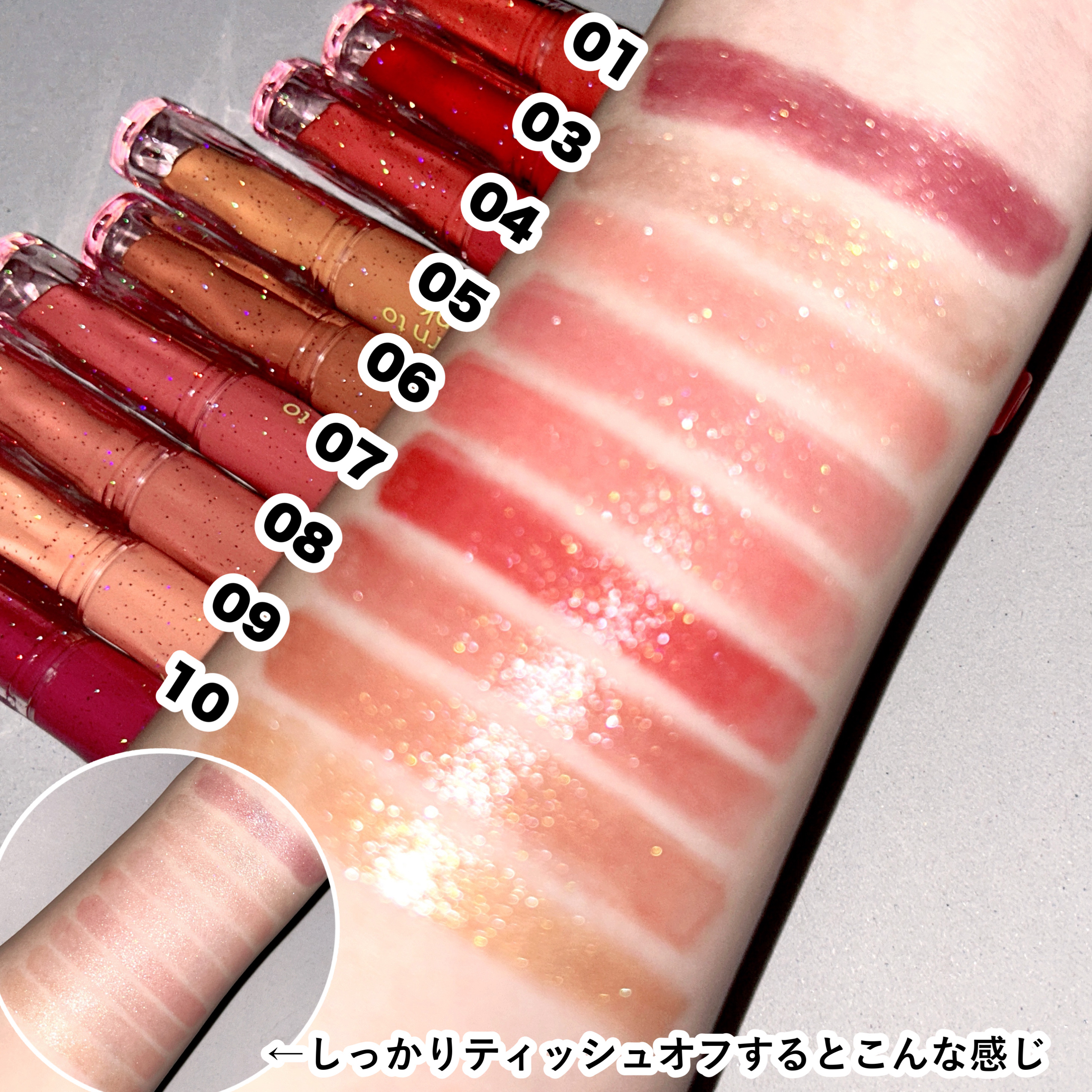 - <商品特長> ●どの角度からも繊細な煌めきを感じる唇へ ダイヤモンドホワイトとゴールドの超微粒子パール*を贅沢に配合。 煌めくグリッターレイヤリングでどの角度から見てもまばゆい輝きを放つ美唇に仕上がります。 グロッシーバームが唇へピタッと密着するため、ひと塗りで立体感のあるボリューミィなぽってり肉厚唇を叶えます。 *合成フルオロフロゴパイト/ ホウケイ酸(Ca/Al) #10は合成フルオロフロゴパイトのみ #10のみダイヤモンドホワイトのラメを使用。 その他の色は、ダイヤモンドホワイトとゴールドのラメを使用しています。 ●透明感あふれるクリアな光沢感 繊細なきらめきとピュアな彩りを叶えるリップカラー。 とろけ出すうる艶感が、グリッターの輝きをさらに美しく引き立てます。 ●リップオイル効果でぷるぷる唇続く 3種のリッチなリップケア成分*を配合。 唇にうるおいを与え、乾燥や皮むけを防ぎながら、しっとりなめらかな仕上がりを叶えます。 べたつかず、たっぷりの水分感を保ちながらも軽さを感じる使用感を実現。 リップクリームのように持続する高い保湿力があり、つけたてのツヤとうるおいを長時間キープします。 ・クルエルティフリー(動物実験をしていない) * シア脂・ババス油・ビタミンE(酢酸トコフェロール)/全て保湿