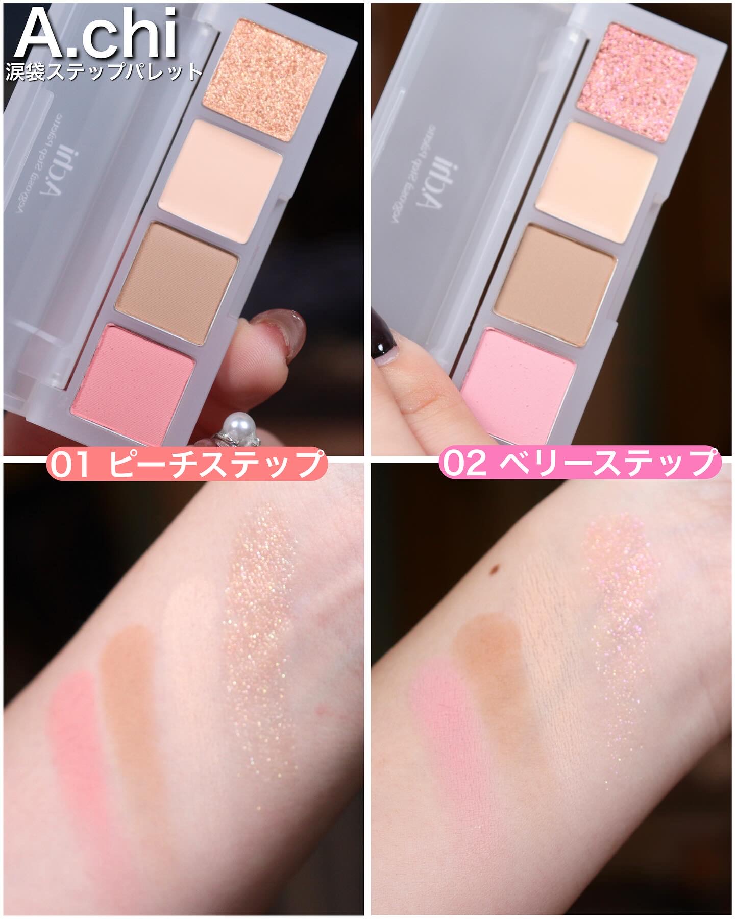 A.chi涙袋ステップパレット𝜗𝜚˚⋆01ピーチステップ🍑(イエベ向け)02ベリーステップ🍓(ブルベ向け)ぷっくり涙袋には必須のコンシーラーと影カラーに加え、血色感を与えてくれるぽよんピンクとポイントグリッターが一緒になった万能パレット🪄コン...