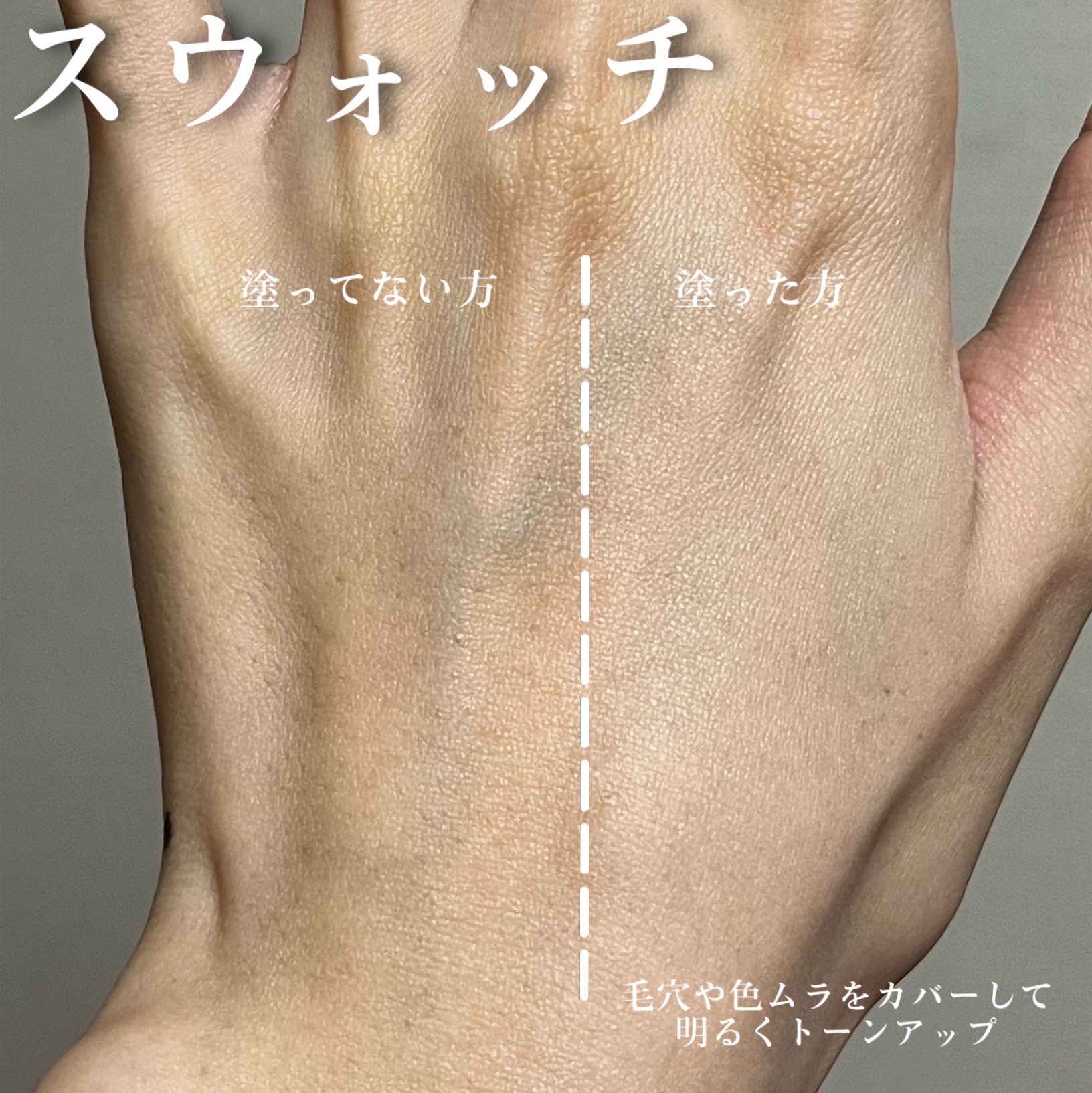 まぶたのくすみをカバーして、アイシャドウの発色&モチUP!! ベースメイク後、アイシャドウを塗る前(アイメイク前)に使います! アイシャドウベースを使う方が、アイシャドウの発色が良いです🙆♀️ 右側のベース有りの方が発色がよく、ラメも綺麗ですよね! アイシャドウベース無しでもメイクは成り立つので、必須ではありません。 それでもアイシャドウベース有りの方が発色がよく、モチもいいです! アイシャドウベース、個人的にはメイクに慣れてきてレベルアップしたい方、メイクの幅を広げたい方におすすめです!
