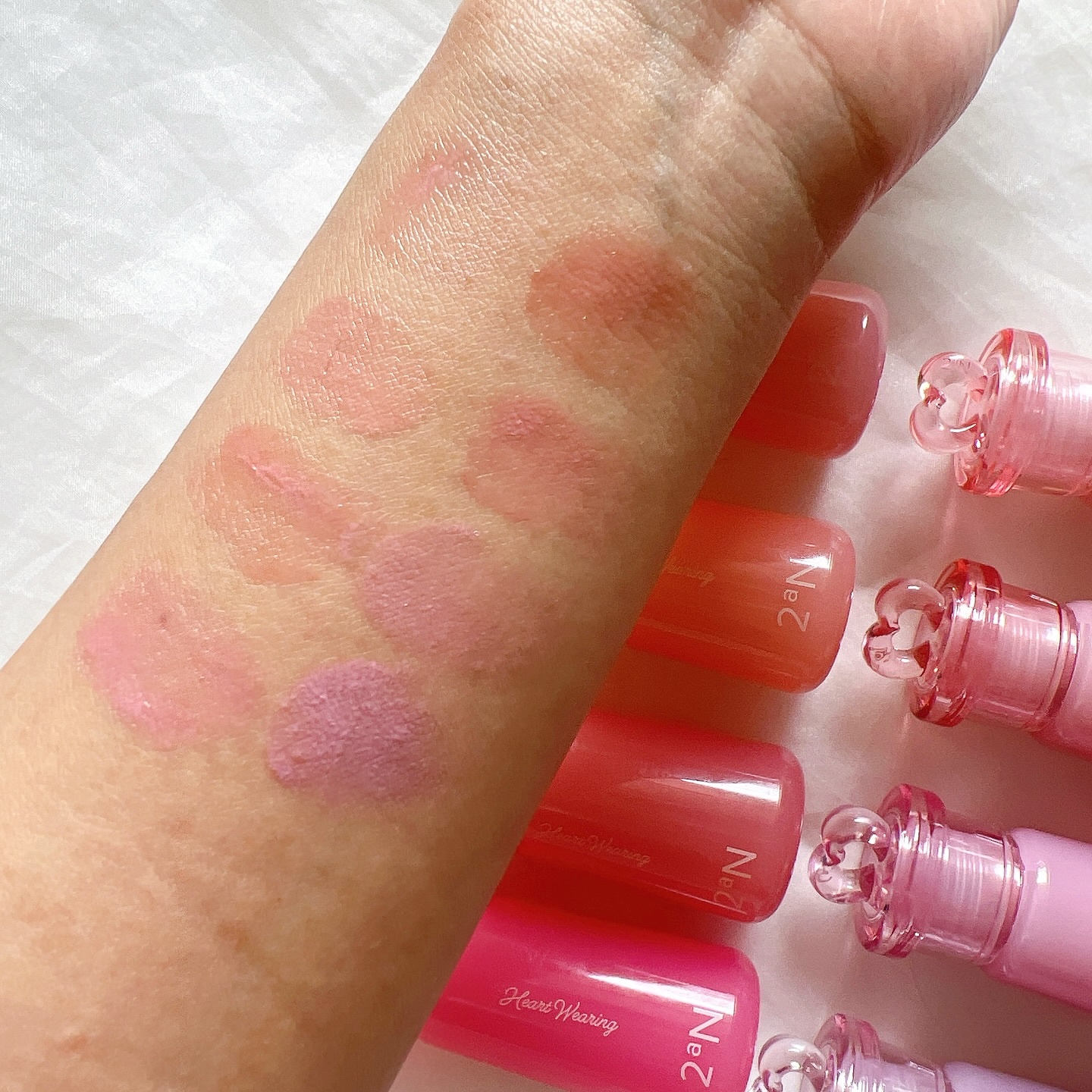 candydollケアオイルティントリップ.キャンディドールのガチレポ企画でもらいました❤️全色スウォッチ✨✨上から501,502,503,504,505だよ🌸.個人的には501がお気に入り😇❤️開発でも1番色味を決めるのが大変だったんだって...