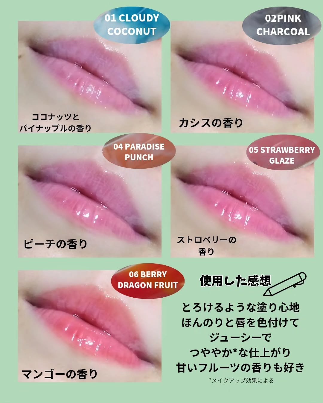 BabyBrightさまより商品提供にていただきました🍹今回紹介するのはヘルシースムージーリップ・01CLOUDYCOCONUT🥥★pH変色ココナッツ+パイナップルの香り・02PINKCHARCOAL💜★pH変色カシスの香り・04PARADI...
