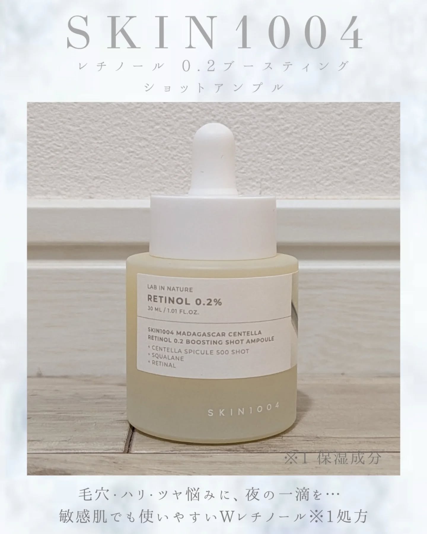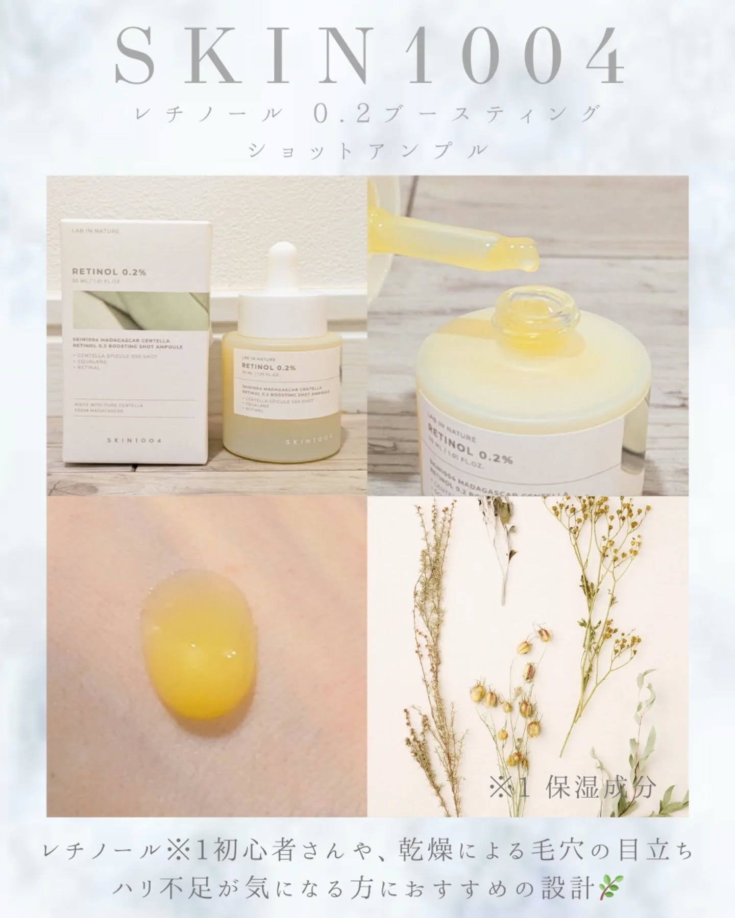 「レチノール初心者の私でも使いやすい💛」@skin1004_japanSKIN1004レチノール0.2ブースティングショットアンプルを使ってみました🌙とろみのあるのに軽いテクスチャーで、肌にスーッとなじんでベタつかない!翌朝は肌がやわらかく、...