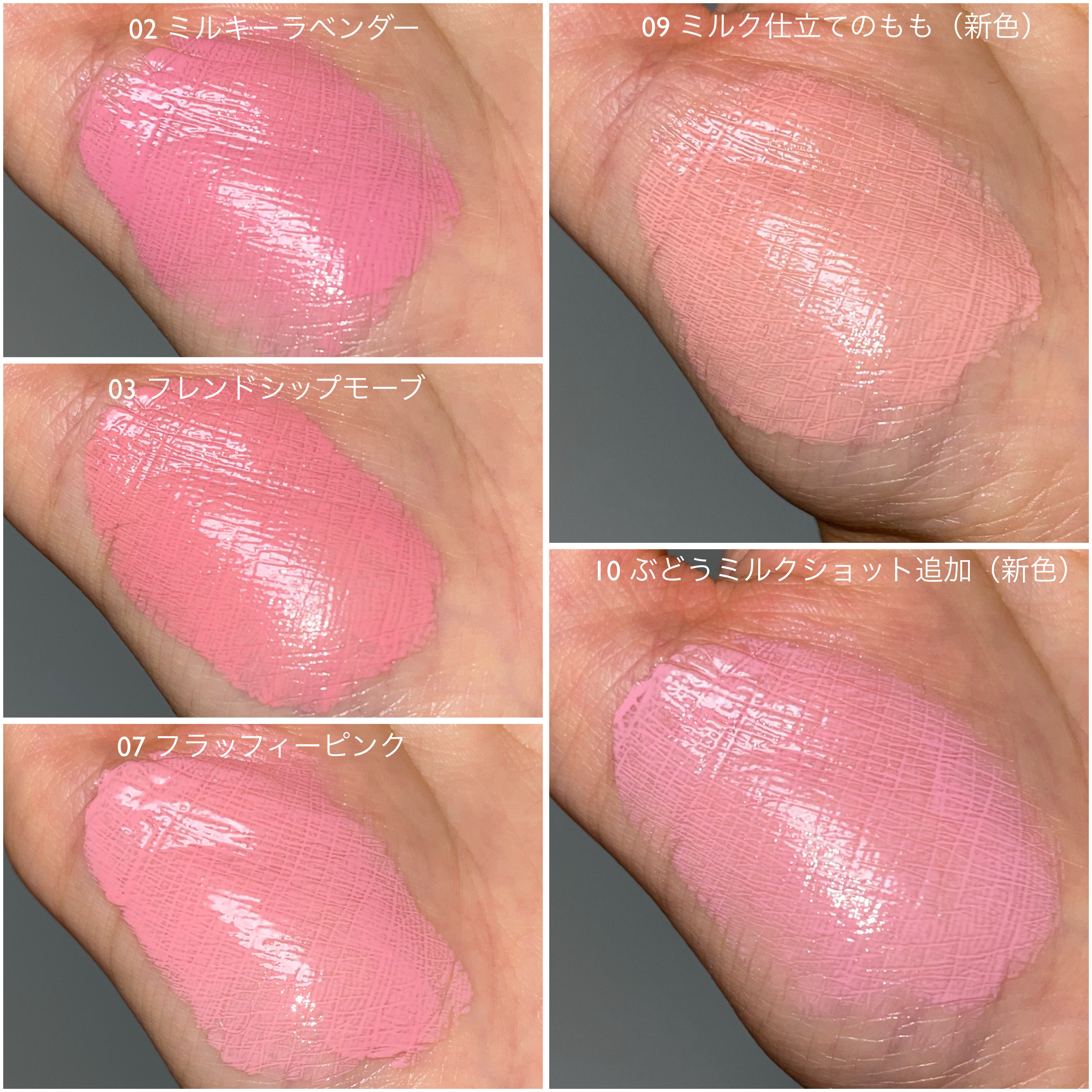 - <01 ライトピーチ> 水添ポリイソブテン、水添ポリ(C6-14オレフィン)、マイカ、リンゴ酸ジイソステアリル、オクチルドデカノール、トリメチルシロキシケイ酸、イソドデカン、水添(スチレン/イソプレン)コポリマー、シリカ、イソステアリン酸ソルビタン、セスキオレイン酸ソルビタン、ジステアルジモニウムヘクトライト、フェノキシエタノール、炭酸プロピレン、トリエトキシカプリリルシラン、水酸化Al、香料、ポリヒドロキシステアリン酸、テトラ(ジ-t-ブチルヒドロキシヒドロケイヒ酸)ペンタエリスリチル、トコフェロール、酸化チタン、酸化鉄、黄4、赤104(1)、黄5 <02 ミルキーラベンダー> 水添ポリイソブテン、水添ポリ(C6-14オレフィン)、マイカ、リンゴ酸ジイソステアリル、オクチルドデカノール、トリメチルシロキシケイ酸、イソドデカン、水添(スチレン/イソプレン)コポリマー、シリカ、イソステアリン酸ソルビタン、セスキオレイン酸ソルビタン、ジステアルジモニウムヘクトライト、フェノキシエタノール、炭酸プロピレン、トリエトキシカプリリルシラン、水酸化Al、香料、ポリヒドロキシステアリン酸、テトラ(ジ-t-ブチルヒドロキシヒドロケイヒ酸)ペンタエリスリチル、トコフェロール、酸化チタン、赤202、酸化鉄、青1 <03 フレンドシップモーブ> 水添ポリイソブテン、水添ポリ(C6-14オレフィン)、マイカ、リンゴ酸ジイソステアリル、オクチルドデカノール、トリメチルシロキシケイ酸、イソドデカン、水添(スチレン/イソプレン)コポリマー、シリカ、イソステアリン酸ソルビタン、セスキオレイン酸ソルビタン、ジステアルジモニウムヘクトライト、フェノキシエタノール、炭酸プロピレン、トリエトキシカプリリルシラン、水酸化Al、香料、ポリヒドロキシステアリン酸、テトラ(ジ-t-ブチルヒドロキシヒドロケイヒ酸)ペンタエリスリチル、トコフェロール、酸化チタン、酸化鉄、赤202 <04 サンシャインフィグ> 水添ポリイソブテン、水添ポリ(C6-14オレフィン)、マイカ、リンゴ酸ジイソステアリル、オクチルドデカノール、トリメチルシロキシケイ酸、イソドデカン、水添(スチレン/イソプレン)コポリマー、シリカ、イソステアリン酸ソルビタン、セスキオレイン酸ソルビタン、ジステアルジモニウムヘクトライト、フェノキシエタノール、炭酸プロピレン、トリエトキシカプリリルシラン、水酸化Al、香料、ポリヒドロキシステアリン酸、テトラ(ジ-t-ブチルヒドロキシヒドロケイヒ酸)ペンタエリスリチル、トコフェロール、酸化チタン、酸化鉄、赤202 <05 クールアップル> 水添ポリイソブテン、水添ポリ(C6-14オレフィン)、マイカ、リンゴ酸ジイソステアリル、オクチルドデカノール、トリメチルシロキシケイ酸、イソドデカン、水添(スチレン/イソプレン)コポリマー、シリカ、イソステアリン酸ソルビタン、セスキオレイン酸ソルビタン、ジステアルジモニウムヘクトライト、フェノキシエタノール、炭酸プロピレン、香料、トリエトキシカプリリルシラン、水酸化Al、ポリヒドロキシステアリン酸、テトラ(ジ-t-ブチルヒドロキシヒドロケイヒ酸)ペンタエリスリチル、トコフェロール、酸化チタン、酸化鉄、赤104(1)、赤202、黄4 <09 ミルク仕立てのもも(限定)> 水添ポリイソブテン、水添ポリ(C6-14オレフィン)、マイカ、リンゴ酸ジイソステアリル、オクチルドデカノール、トリメチルシロキシケイ酸、イソドデカン、水添(スチレン/イソプレン)コポリマー、シリカ、イソステアリン酸ソルビタン、セスキオレイン酸ソルビタン、ジステアルジモニウムヘクトライト、フェノキシエタノール、炭酸プロピレン、香料、テトラ(ジ-t-ブチルヒドロキシヒドロケイヒ酸)ペンタエリスリチル、トコフェロール、酸化チタン、酸化鉄、赤202、黄5、黄4 <10 ぶどうミルクショット追加(限定)> 水添ポリイソブテン、水添ポリ(C6-14オレフィン)、マイカ、リンゴ酸ジイソステアリル、オクチルドデカノール、トリメチルシロキシケイ酸、イソドデカン、水添(スチレン/イソプレン)コポリマー、シリカ、イソステアリン酸ソルビタン、セスキオレイン酸ソルビタン、ジステアルジモニウムヘクトライト、フェノキシエタノール、炭酸プロピレン、香料、テトラ(ジ-t-ブチルヒドロキシヒドロケイヒ酸)ペンタエリスリチル、トコフェロール、酸化チタン、黄4、赤104(1)、赤202、青1