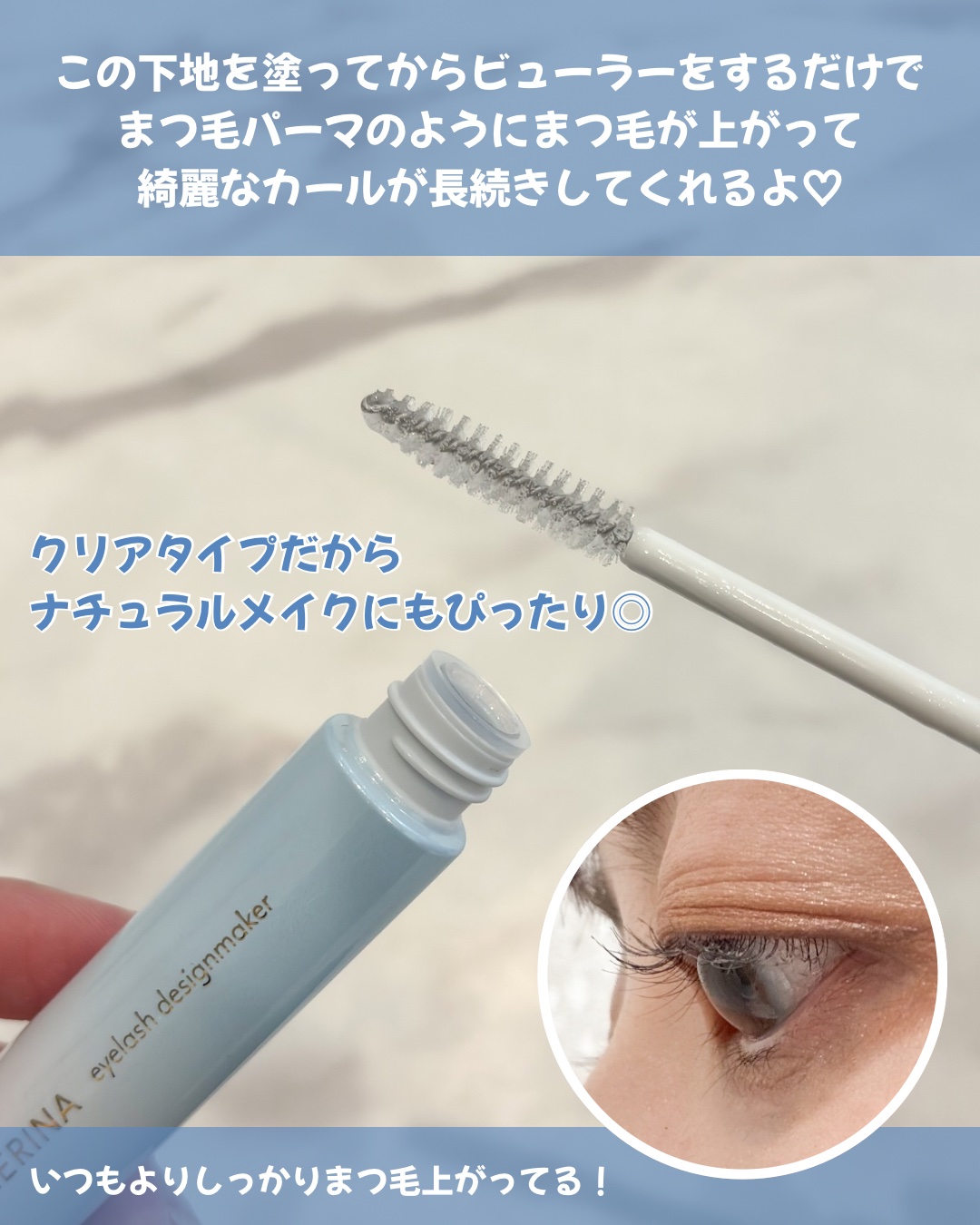 - まつ毛メイクの新時代到来! 【まるで1DAYまつ毛パーマ®】 「メイクでまつ毛パーマができれば!」 開発者のそんな思いから誕生。 ビューラー前の使用で“まつ毛パーマしたて”のような仕上がりを実現。 機能①:カールアップ力 ビューラー前に使用することでまつ毛が上がりやすくなる。 機能②:カールキープ力 ビューラーで付けるカールを記憶する「スタイリングメモリー*成分」配合で仕上がりを長時間キープ。 *洗い流されるまでの一時的な効果 機能③:まつ毛の向きを整える バラつきまつ毛の向きを整え、コーティング。綺麗な扇状まつ毛に仕上がる。 ★まつ毛パーマ取れかけのバラバラまつ毛も綺麗に整うため、まるでまつ毛パーマしたてのような仕上がりになります。