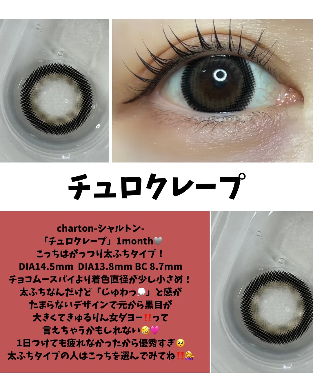 Charton˚✦\きぬちゃんイメージモデル/自分史上最強に可愛くなれるシャルトン恋落ちマンスリーシリーズ新登場🤍⁺⊹˚✧ChurroCrepe#チュロクレープ依存度高めのドーリーカラコン太フチ×ミルクグレージュカラーちゅるんと心奪われる罪な...