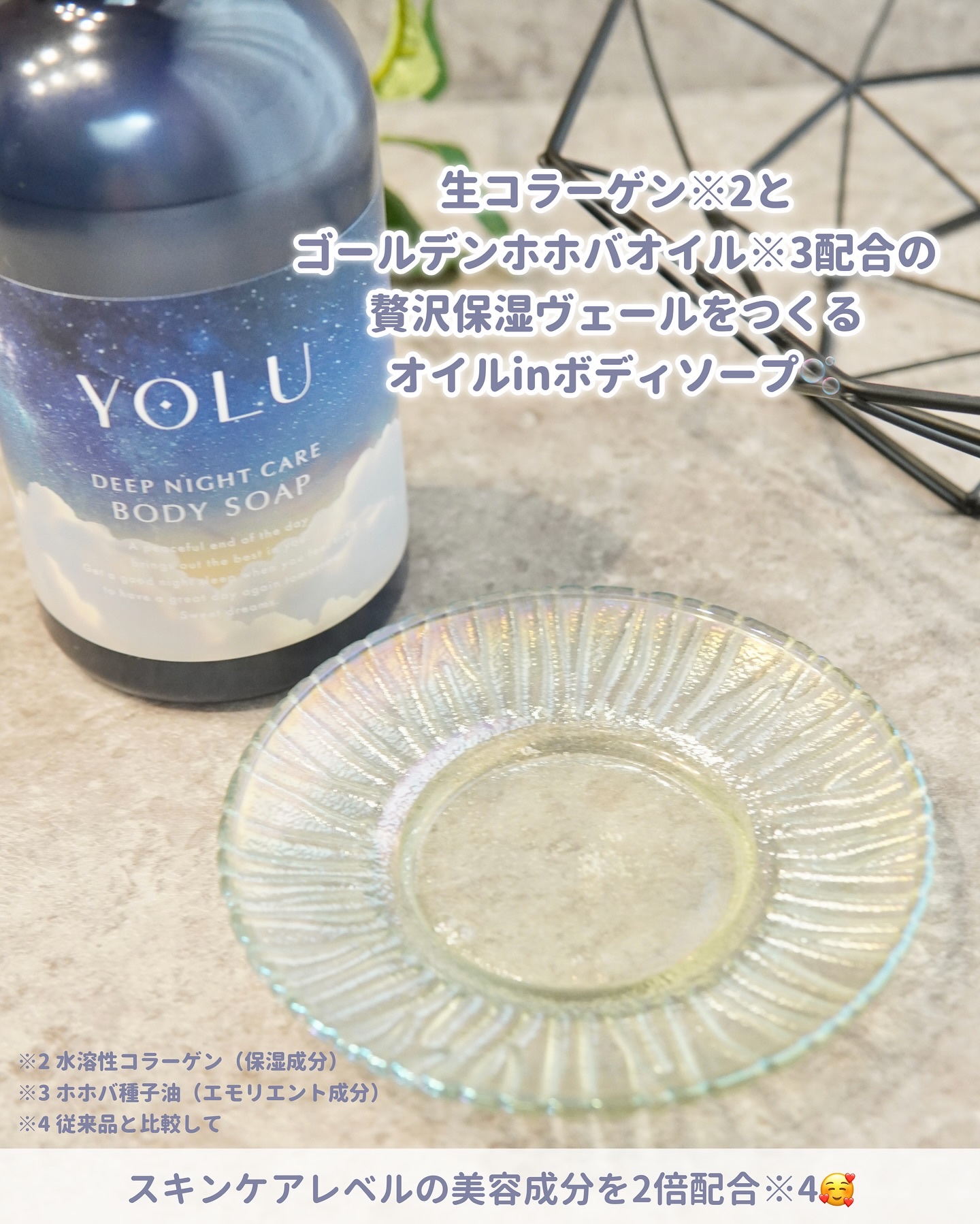 - 商品コンセプト:YOLUボディソープシリーズ最高保湿※1。特に乾燥が気になる方のための贅沢保湿ヴェールをつくるオイルinボディソープ 1、生コラーゲン※2とゴールデンホホバオイル※3がうるおいをキャッチして逃さない。贅沢保湿ヴェールに包まれながら乾燥ケア。 2、使った方が肌がしっとりもっちり。スキンケアレベルの美容液成分を2倍配合※4。 3、乾燥ダメージを受けた肌を考えた処方設計。オーバーナイトバリア処方とアミノ酸系界面活性剤を採用。 4、イランイラン香る、優雅な夜へと導くアロマティックフレグランス ※1 現シリーズ比較 ※2 水溶性コラーゲン(保湿成分) ※3 ホホバ種子油(エモリエント成分) ※4 従来品と比較して