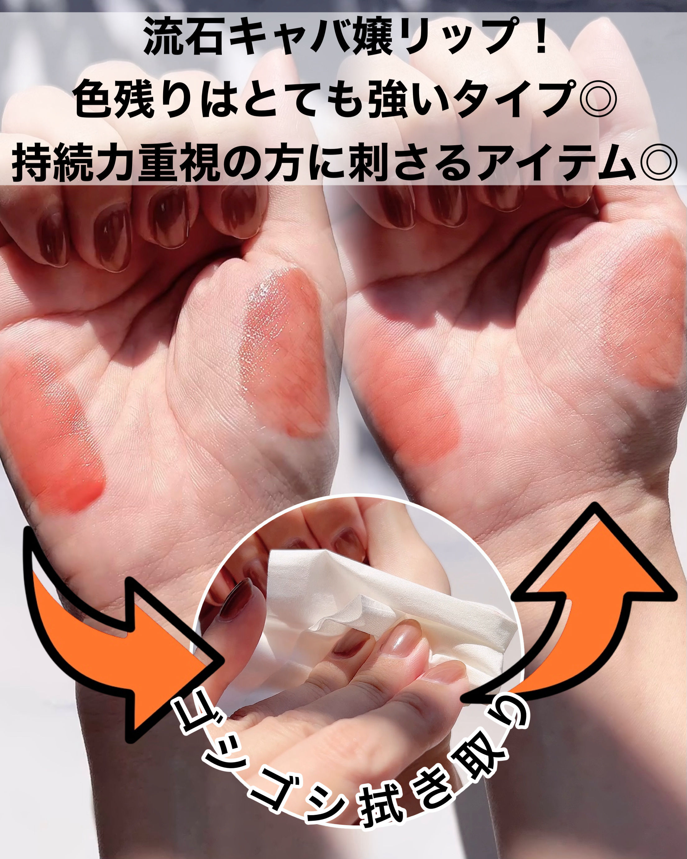 | リップティントランキング第3位 | 重ねて塗っても、ちゅるんと透け感が残って明るめカラーがとっても映える…💕色残りも◎ | 詳細を見る | ||