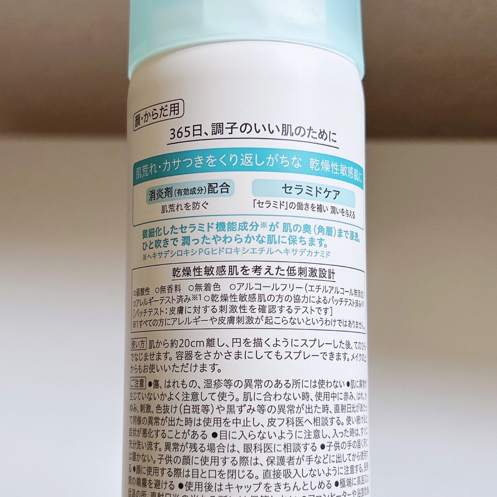 - 【敏感肌用】 微細化したセラミド機能成分*が肌の奥(角層)まで浸透。 ひと吹きで潤ったやわらかな肌に保ちます。 *ヘキサデシロキシPGヒドロキシエチルヘキサデカナミド ●消炎剤配合(有効成分)配合。肌荒れを防ぐ。 ●潤い成分(ユーカリエキス)配合。 ●ケアしづらい背中や腰など、全身に。 ●一日中、顔やからだにいつでもどこでも潤い補給。 お風呂あがりに。メイクの上から。お子さまのデリケートな肌にも。 (医薬部外品) 商品に関するお問い合わせ 受付時間9:00~17:00(土曜・日曜・祝日除く) *製品の誤飲・誤食など緊急の場合は、受付時間外でもお電話ください キュレル:0120-165-698
