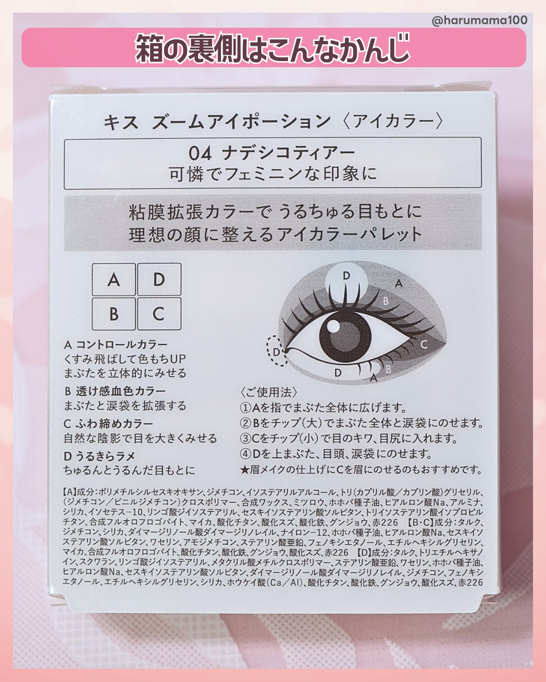 - <01 アーモンドミスト> 【A】成分:ポリメチルシルセスキオキサン、ジメチコン、イソステアリルアルコール、トリ(カプリル酸/カプリン酸)グリセリル、(ジメチコン/ビニルジメチコン)クロスポリマー、合成ワックス、ミツロウ、ホホバ種子油、ヒアルロン酸Na、アルミナ、リンゴ酸ジイソステアリル、シリカ、イソセテス-10、トリイソステアリン酸イソプロピルチタン、酸化チタン、マイカ、合成フルオロフロゴパイト、酸化鉄、酸化スズ 【B・C】成分:タルク、ジメチコン、シリカ、ダイマージリノール酸ダイマージリノレイル、ナイロン-12、ホホバ種子油、ヒアルロン酸Na、セスキイソステアリン酸ソルビタン、ワセリン、アモジメチコン、ステアリン酸亜鉛、フェノキシエタノール、エチルヘキシルグリセリン、トコフェロール、マイカ、酸化鉄、酸化チタン、合成フルオロフロゴパイト、酸化スズ、グンジョウ 【D】成分:タルク、トリエチルヘキサノイン、スクワラン、リンゴ酸ジイソステアリル、メタクリル酸メチルクロスポリマー、ステアリン酸亜鉛、ワセリン、ホホバ種子油、ヒアルロン酸Na、セスキイソステアリン酸ソルビタン、ダイマージリノール酸ダイマージリノレイル、ジメチコン、フェノキシエタノール、エチルヘキシルグリセリン、シリカ、ホウケイ酸(Ca/Al)、酸化チタン、酸化スズ、酸化鉄 <02 メープルフロー> 【A】成分:ポリメチルシルセスキオキサン、ジメチコン、イソステアリルアルコール、トリ(カプリル酸/カプリン酸)グリセリル、(ジメチコン/ビニルジメチコン)クロスポリマー、合成ワックス、ミツロウ、ホホバ種子油、ヒアルロン酸Na、アルミナ、リンゴ酸ジイソステアリル、シリカ、イソセテス-10、トリイソステアリン酸イソプロピルチタン、酸化チタン、マイカ、合成フルオロフロゴパイト、酸化鉄、酸化スズ、 【B・C】成分:タルク、ジメチコン、シリカ、ダイマージリノール酸ダイマージリノレイル、ナイロン-12、ホホバ種子油、ヒアルロン酸Na、セスキイソステアリン酸ソルビタン、ワセリン、アモジメチコン、ステアリン酸亜鉛、フェノキシエタノール、エチルヘキシルグリセリン、マイカ、合成フルオロフロゴパイト、酸化チタン、酸化鉄、ホウケイ酸(Ca/Al)、酸化スズ、グンジョウ、赤226、 【D】成分:タルク、トリエチルヘキサノイン、スクワラン、リンゴ酸ジイソステアリル、メタクリル酸メチルクロスポリマー、ステアリン酸亜鉛、ワセリン、ホホバ種子油、ヒアルロン酸Na、セスキイソステアリン酸ソルビタン、ダイマージリノール酸ダイマージリノレイル、ジメチコン、フェノキシエタノール、エチルヘキシルグリセリン、シリカ、ホウケイ酸(Ca/Al)、酸化チタン、酸化鉄、酸化スズ、グンジョウ <03 ロゼストリーム> 【A】成分:ポリメチルシルセスキオキサン、ジメチコン、イソステアリルアルコール、トリ(カプリル酸/カプリン酸)グリセリル、(ジメチコン/ビニルジメチコン)クロスポリマー、合成ワックス、ミツロウ、ホホバ種子油、ヒアルロン酸Na、アルミナ、シリカ、イソセテス-10、リンゴ酸ジイソステアリル、セスキイソステアリン酸ソルビタン、トリイソステアリン酸イソプロピルチタン、合成フルオロフロゴパイト、マイカ、酸化チタン、酸化スズ、酸化鉄、グンジョウ、赤226 【B・C】成分:タルク、ジメチコン、シリカ、ダイマージリノール酸ダイマージリノレイル、ナイロン-12、ホホバ種子油、ヒアルロン酸Na、セスキイソステアリン酸ソルビタン、ワセリン、アモジメチコン、ステアリン酸亜鉛、フェノキシエタノール、エチルヘキシルグリセリン、マイカ、酸化チタン、合成フルオロフロゴパイト、酸化鉄、酸化スズ、グンジョウ、赤226 【D】成分:タルク、トリエチルヘキサノイン、スクワラン、リンゴ酸ジイソステアリル、メタクリル酸メチルクロスポリマー、ステアリン酸亜鉛、ワセリン、ホホバ種子油、ヒアルロン酸Na、セスキイソステアリン酸ソルビタン、ダイマージリノール酸ダイマージリノレイル、ジメチコン、フェノキシエタノール、エチルヘキシルグリセリン、シリカ、ホウケイ酸(Ca/Al)、合成フルオロフロゴパイト、酸化チタン、酸化鉄、酸化スズ、グンジョウ <04 ナデシコティアー> 【A】成分:ポリメチルシルセスキオキサン、ジメチコン、イソステアリルアルコール、トリ(カプリル酸/カプリン酸)グリセリル、(ジメチコン/ビニルジメチコン)クロスポリマー、合成ワックス、ミツロウ、ホホバ種子油、ヒアルロン酸Na、アルミナ、シリカ、イソセテス-10、リンゴ酸ジイソステアリル、セスキイソステアリン酸ソルビタン、トリイソステアリン酸イソプロピルチタン、合成フルオロフロゴパイト、マイカ、酸化チタン、酸化スズ、酸化鉄、グンジョウ、赤226、 【B・C】成分:タルク、ジメチコン、シリカ、ダイマージリノール酸ダイマージリノレイル、ナイロン-12、ホホバ種子油、ヒアルロン酸Na、セスキイソステアリン酸ソルビタン、ワセリン、アモ