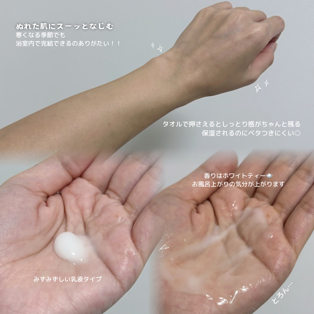 ビオレザボディさまからいただきました。お風呂でぬれた肌に使う乳液。ぬれた肌にそのまま塗るって初めてでしたが、肌にちゃんとなじんでしっとりすべすべに✨まさにうるおい密封!これからの寒い季節に暖かい浴室でそのまま保湿できるのも嬉しい♡ホワイトティ...