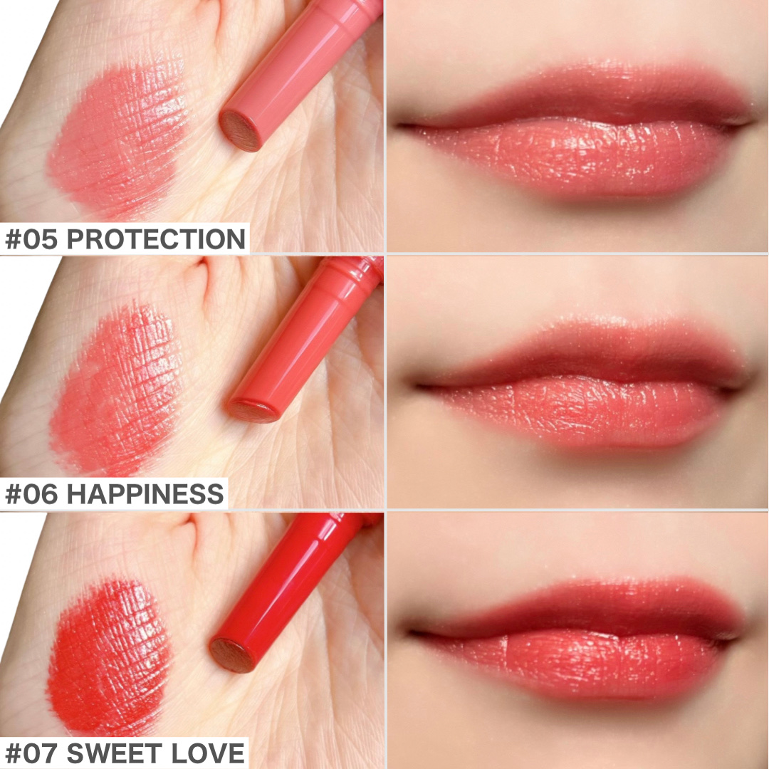 新色は大人かわいい上品な2つのカラー❤️ 06 #ピンクベージュ ナチュラルでどんな場面にも合うような万能なカラー✨ 上品な印象になる仕上がりです💖 07 #ビターレッド 深みのある大人っぽいカラー✨ 華やかな印象になる仕上がりです💖 01 #ナチュラルピンク 女性らしい華やかな印象になるピンク 02 #コーラルレッド 垢抜けたおしゃれな印象になるコーラルレッド 03 #ベージュブラウン 知的で大人っぽい印象になるベージュブラウン 04 #キャメルオレンジ こなれた印象になるオレンジ 05 #プラムレッド 洗練された印象になる青みレッド 色持ちも良くて、ティッシュオフするとマスクにもつきにくくておすすめリップです😊