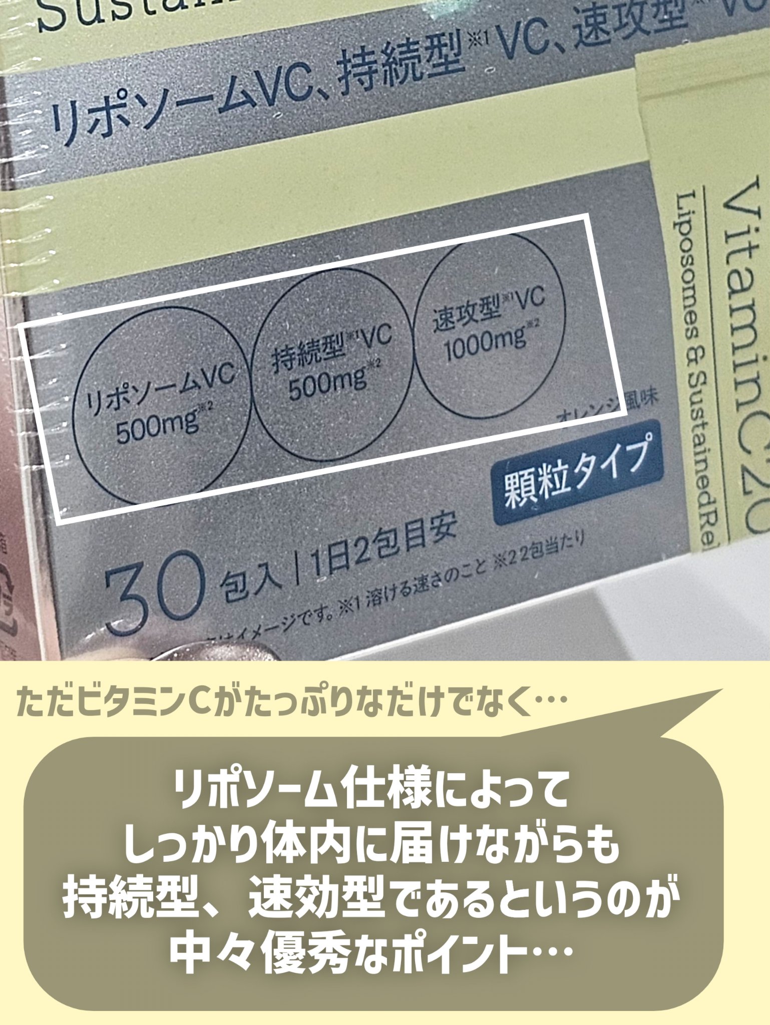 - 「ビタミンC2000 リポソーム+持続型VC」は、リポソーム型、持続型、速攻型の3種のビタミンCを組み合わせて2000mg配合。さらにセラミドなども加えた贅沢設計です。