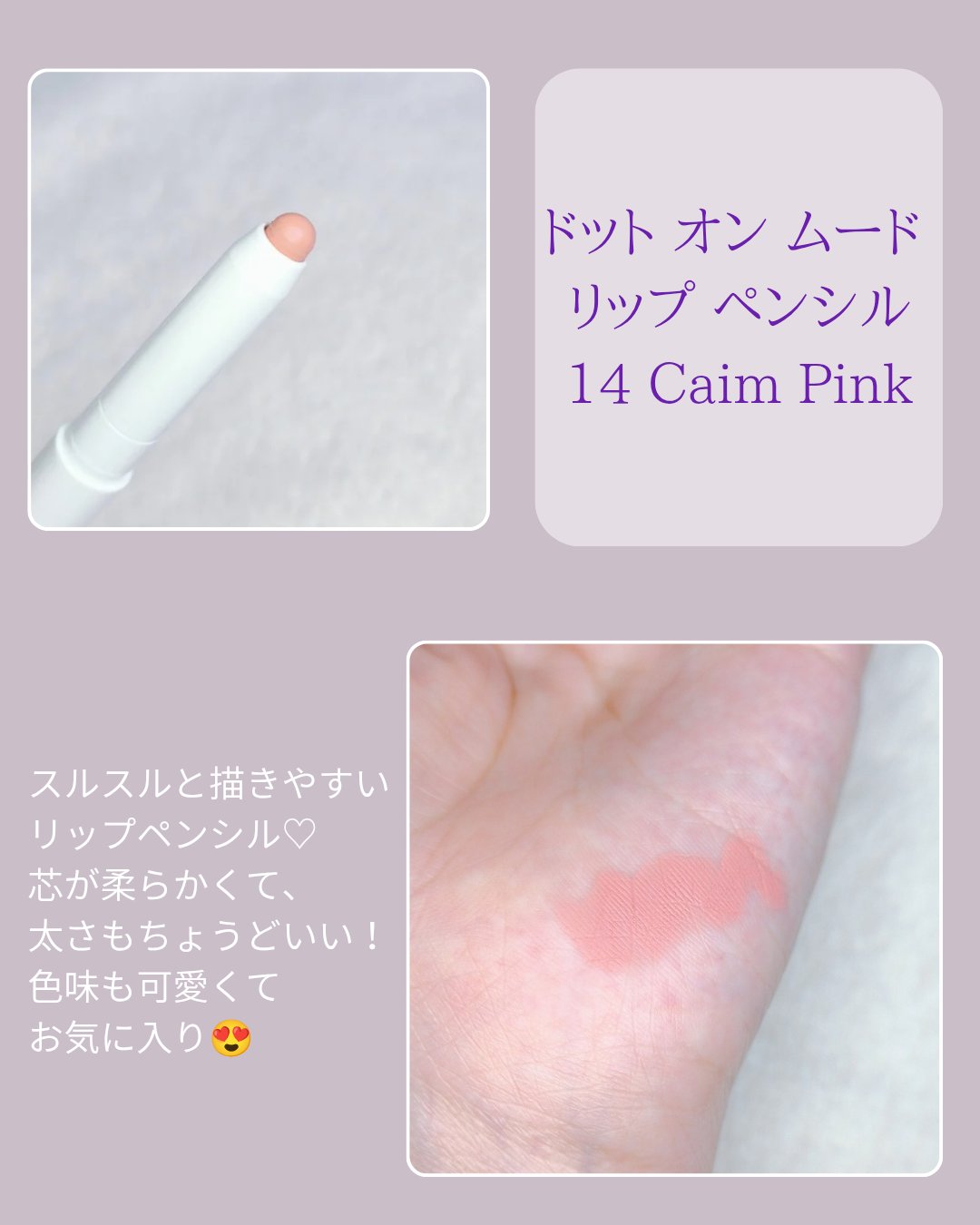 HeartPercentドットオンムードリップペンシルcolor:14calmpink価格:1,540円(税込)こちら、YouTuberの鹿の間ちゃんが使ってたもので、ずっと買いたい!!って思ってたものです💁♀️使った感想は思ったよりピンク...