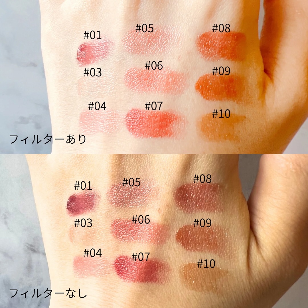 ビタミンE、アプリコットカーネルオイル、グレープシードオイルが乾燥した唇を保湿してくれるティントです。 04はオレンジという名前がついてますが、朱色っぽさを感じます。イエベ秋の私にとっては使いやすい色です。 香りはどちらもピーチのような甘い香りがします。