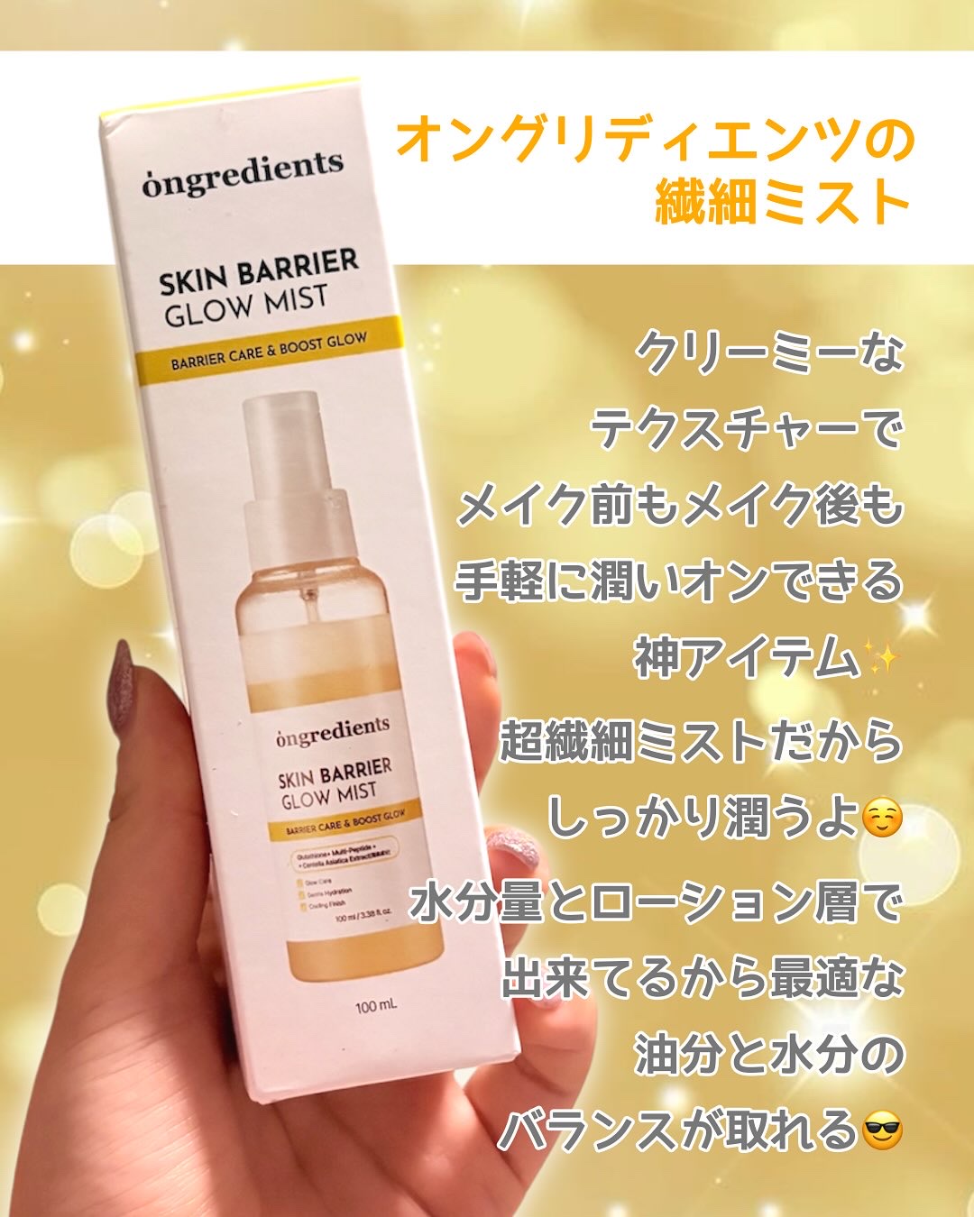 - 「ongredients(オングリディエンツ)」が、ついに日本のオフライン店舗に登場! <2025年8月30日(土)(※1)より全国のプラザ、ドン・キホーテ(※2)にて先行販売を開始> 水光トナーと水分グロウ成分が融合し、まるでハイライトを施したようなツヤ肌ミストを実現 【主要成分】 ・ツボクサ葉エキス(※3) 外的刺激を受けた肌を落ち着かせ、肌バリア(※4)機能を守ります。 ・複合ペプチド(※5) 肌のコンディションを整え、ハリのある肌印象へと導きます。 ・ヒアルロン酸(※6)&パンテノール(※7) 乾燥した肌を保湿ししっとり健やかに整えます。 【こんな方におすすめ】 ・外的刺激による肌のゆらぎが気になる方 ・保湿とキメのダブルケアをしたい方 ・\メイクの上からでも!/外出先でも、肌にうるおいを与えたい方 (※1)店頭開始日となり、購入可能日は各店舗により異なります。 (※2)一部店舗を除きます。 (※3)鎮静成分 (※4)角質層のうるおいを保つこと (※5)トリペプチド-1銅,トリペプチド-1,パルミトイルトリペプチド-1,パルミトイルペンタペプチド-4,ヘキサペプチド-11,ヘキサペプチド-9 (※6)ヒアルロン酸Na,ヒアルロン酸クロスポリマーNa,ヒアルロン酸K,ヒアルロン酸ヒドロキシプロピルトリモニウム,加水分解ヒアルロン酸Na,加水分解ヒアルロン酸,ヒアルロン酸(保湿成分) (※7)保湿成分