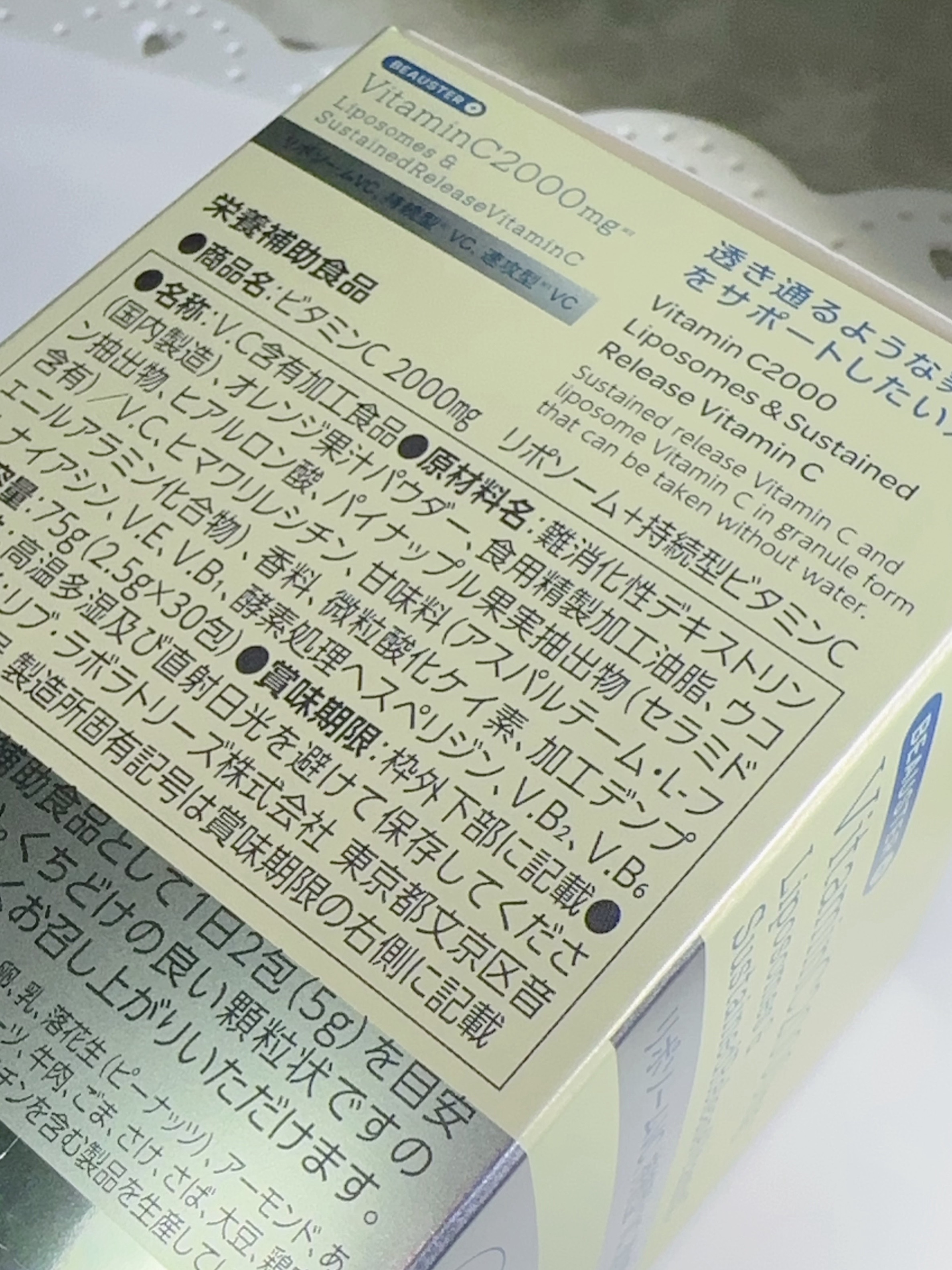- 「ビタミンC2000 リポソーム+持続型VC」は、リポソーム型、持続型、速攻型の3種のビタミンCを組み合わせて2000mg配合。さらにセラミドなども加えた贅沢設計です。