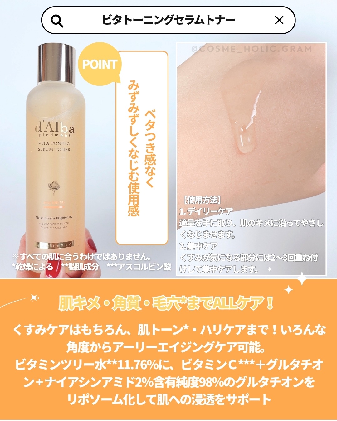 ☑︎d'Albaビタトーニングセラムトナーみずみずしい水分膜で透明感*あふれるツヤ肌に導く濃縮セラムトナー💛とろみのあるテクスチャーだけど肌なじみがよく、ベタつかずにしっとり!生き生きとしたツヤ肌に✨イタリアヴィーガン認証取得で、肌が敏感な時...
