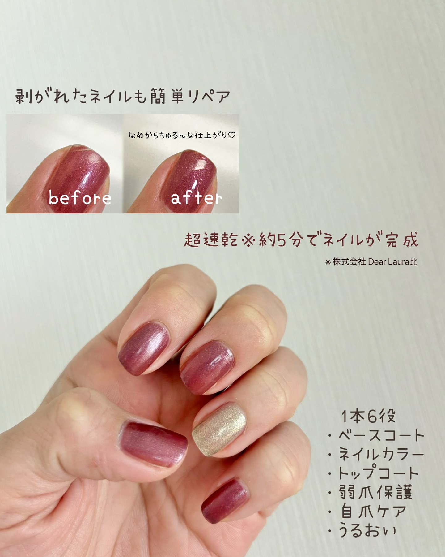- ベーシックは押さえつつ、流行を取り入れながら程よい「オシャレ感」と「女っぽさ」を楽しみたい。そんな女性の期待に応えるアップデートネイルシリーズは、速乾&1度でムラなくキレイに仕上がるから“たった5分”で簡単に、ネイルと気分のアップデートが完成します。ベースコート・ネイルカラー・トップコート・自爪ケア・弱爪保護・うるおいの6役が1本で叶うオールインワン機能に加え、自爪の凸凹をカバーしながらムラなく塗れる「スムースフィットケア処方」を採用。ネイルが剥がれた爪先に上から重ね塗りしてもデコボコせず簡単にお直しすることができます。秋のトレンドカラーを含む、肌なじみの良いスモーキーカラー9色を展開。