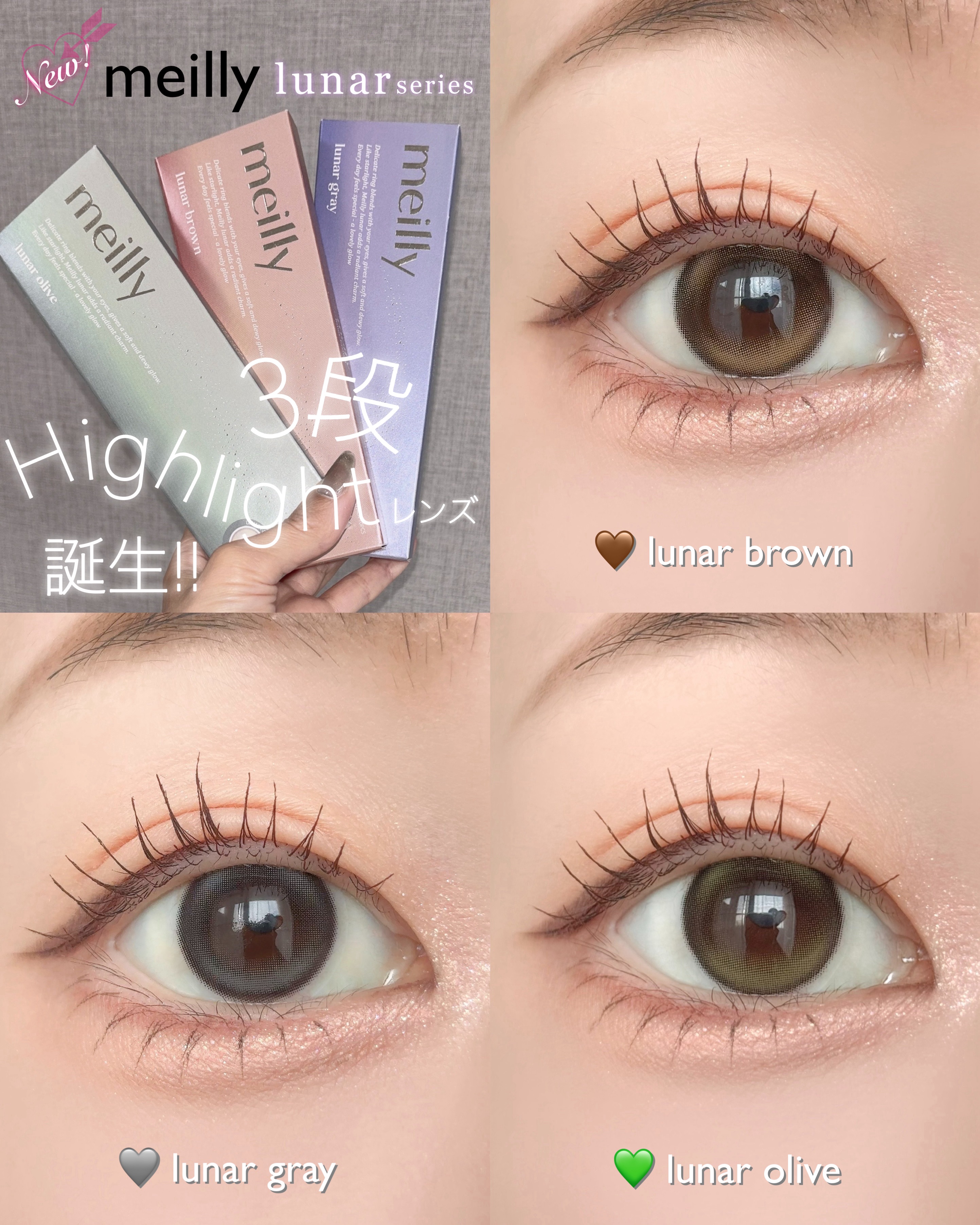 \meillyから新シリーズが登場/3段のハイライトって珍しい?!3段あることによってレンズが回っても気にならないの嬉しい‼︎明るめのハイライターで光を放ったかのような水光カラコンがとっても美しい...このカラコンOLENSが全面バックアップ...