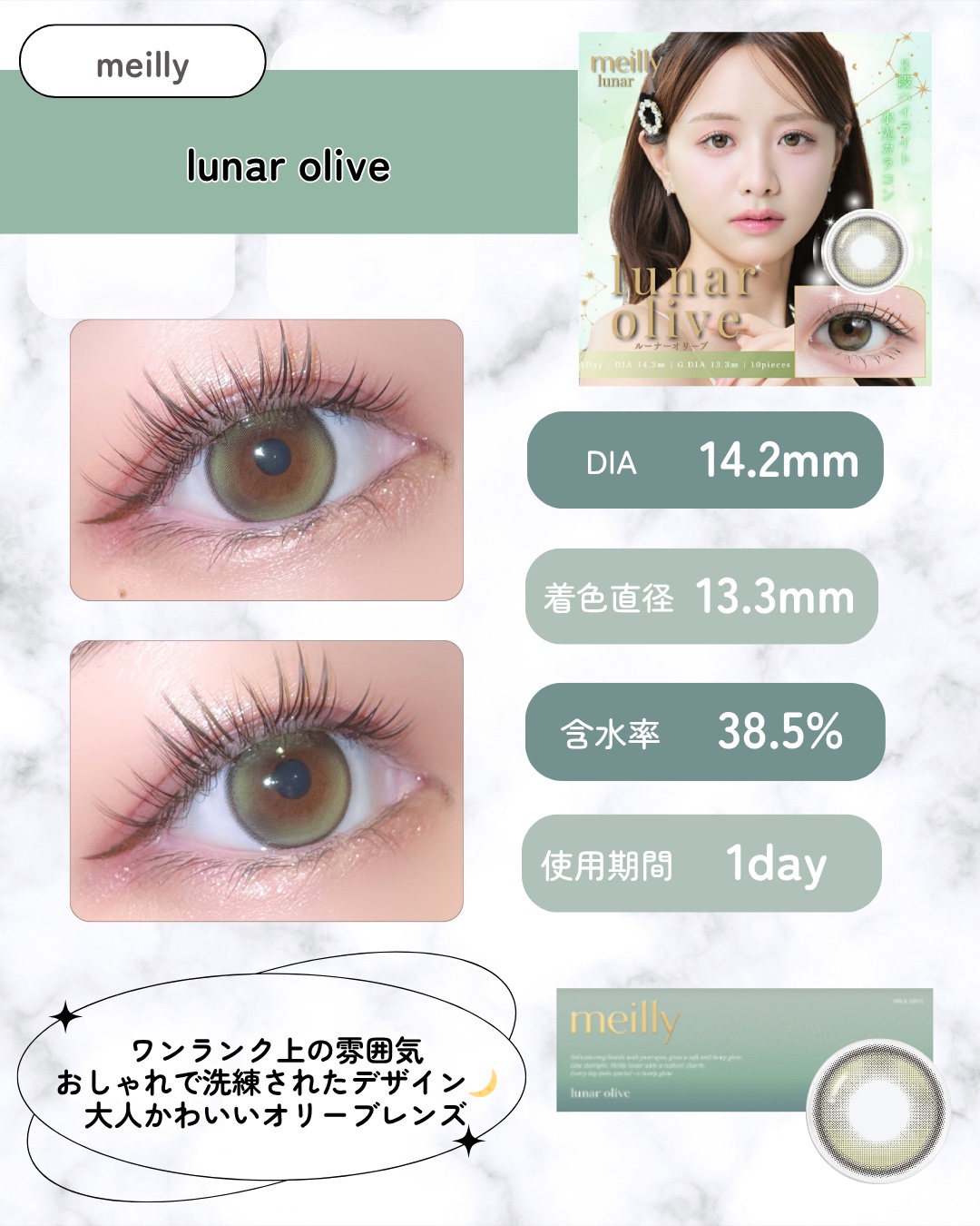 ❤︎@meilly_official_jp⟡.·⎯⎯⎯⎯⎯⎯⎯⎯⎯⎯⎯⎯⟡.·森香澄ちゃん@mori_kasumi_イメージモデルのmeillyから、水光カラコンlunarシリーズが新発売♡︎ᵎᵎᵎDIA14.2mm着色直径13.3mm含水率...