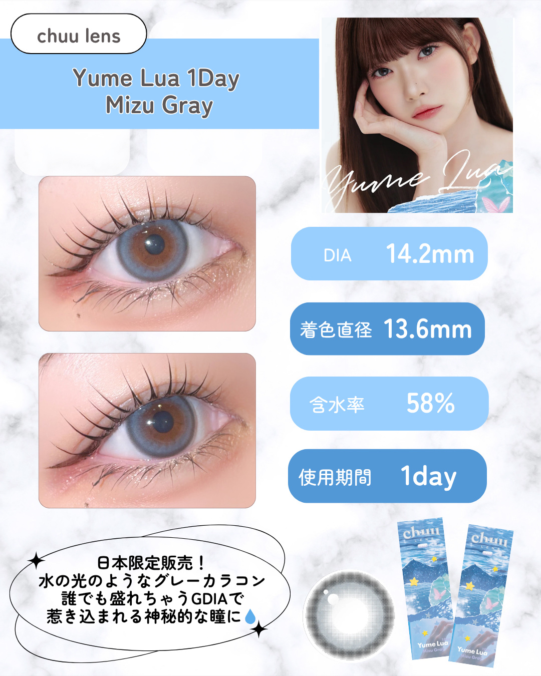 水光ブルーグレーの新作登場🩵ChuuLensYumeLua1DayMizuGrayBilllieのツキちゃんミューズの新作カラコンが9月16日に発売します🩵なんとChuuLens初の着色直径13.6mm!高発色な水光ブルーグレーで太すぎず細す...