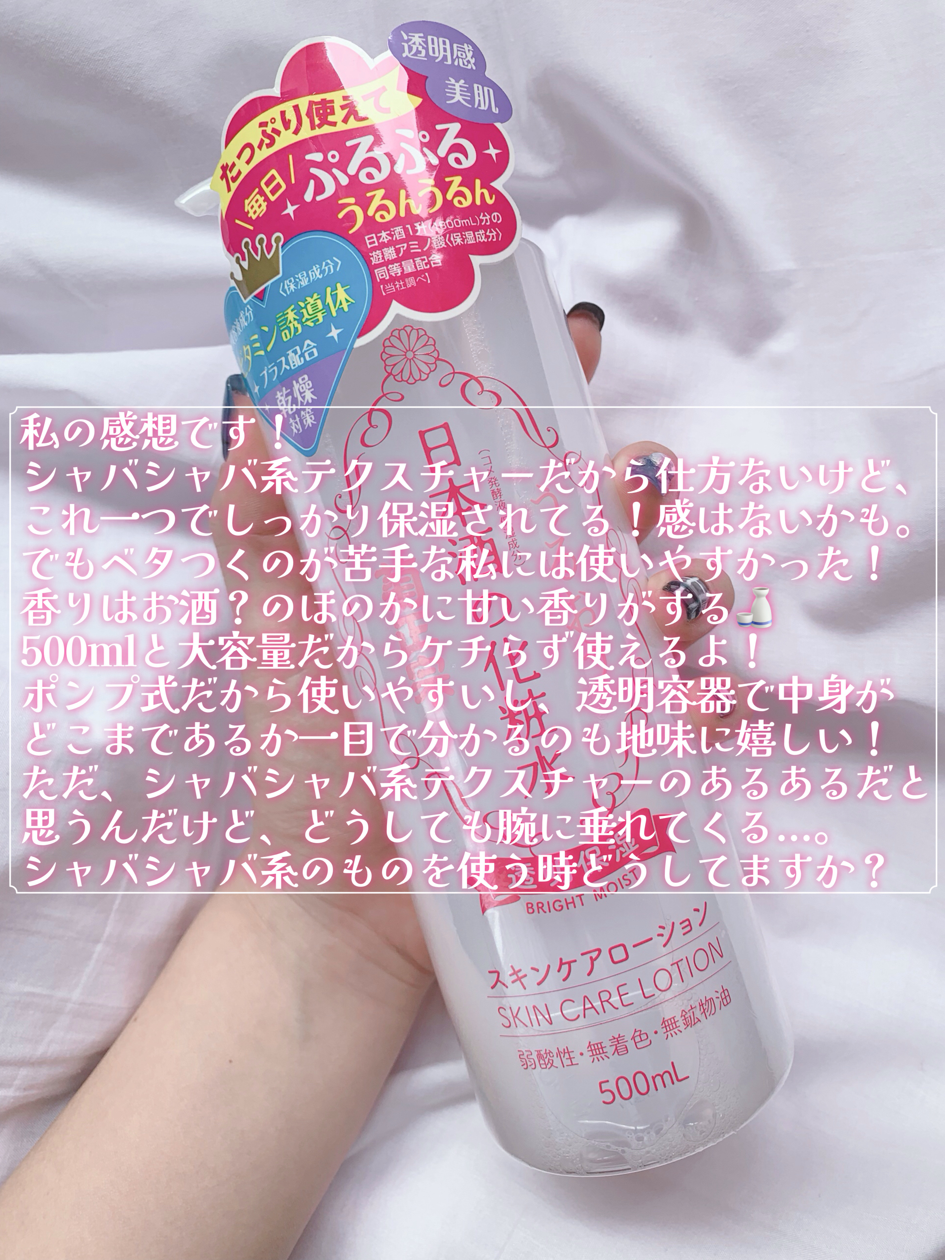 - ■日本酒(コメ発酵液・保湿成分)配合の化粧水。肌荒れを防いでしっとりみずみずしい素肌に。 ■日本酒一升(1.8L)分の遊離アミノ酸(保湿成分)配合でしっとりとうるおいが持続します。 ■3種のビタミン誘導体(保湿成分)配合で透明感のある明るい印象の美肌に。 ■顔にも体にもたっぷり使える大容量。コットンで顔パックにも。 ■便利なポンプ付ボトル。 ■ふわっと香る甘い日本酒の香り。 ■弱酸性・無着色・無鉱物油。