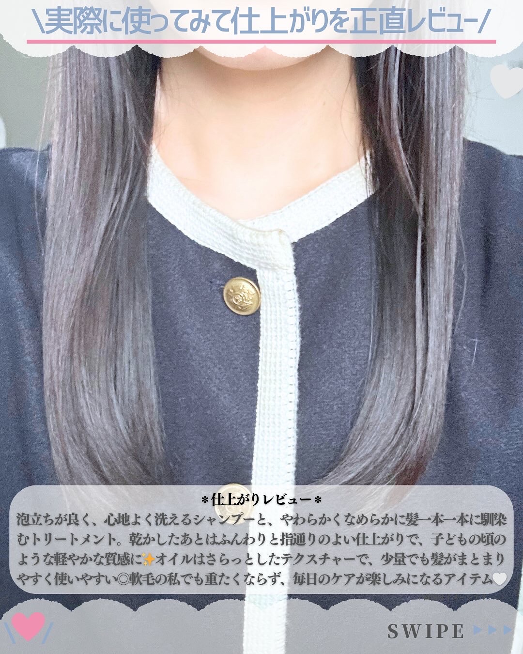 | ヘアケア・スタイリングランキング第109位 | ドライヤーで乾かしてもまとまりが良かったです。髪はしっとりまとまる感じだけど、根元はふんわり。 | 詳細を見る | |