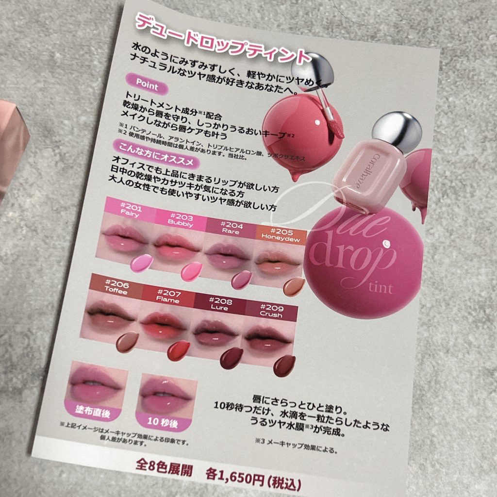 #PR#水膜ティント@Coralhaze_jpさまからいただきました\水滴を一粒たらしたようなうるツヤ水膜*/コーラルヘイズデュードロップティント🎨203.204.206.209¥1,650スルスル塗れてベタつかず軽やかな使い心地🎀軽めのティ...