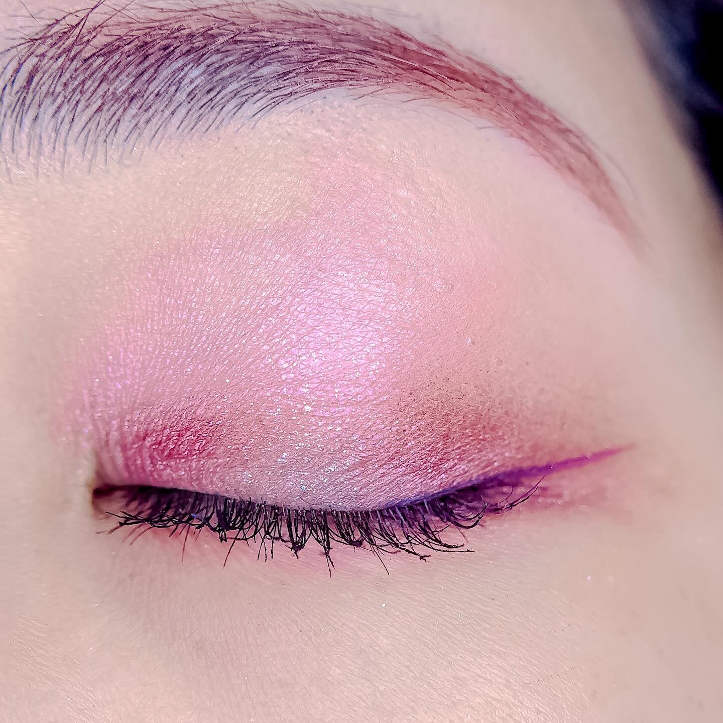 ベースに右上、目頭から黒目上に真ん中、黒目〜目尻に右下を、左上を目頭にくの字に塗ってもらいました✨ ピンクサクラよりもクールな感じで、目で見た色より私の肌では紫っぽく発色しました😍 上2つはラメはぎっしりでときめく💓 ブラウンメイクがとても苦手だけれどこれならブラウンメイク出来そう👌(かなり紫寄りですが) くすみ感は強いので苦手な方は厳しいかも…(特に真ん中) クールな印象になるので大人顔さん向けor大人顔になりたい方向けのイメージです✨