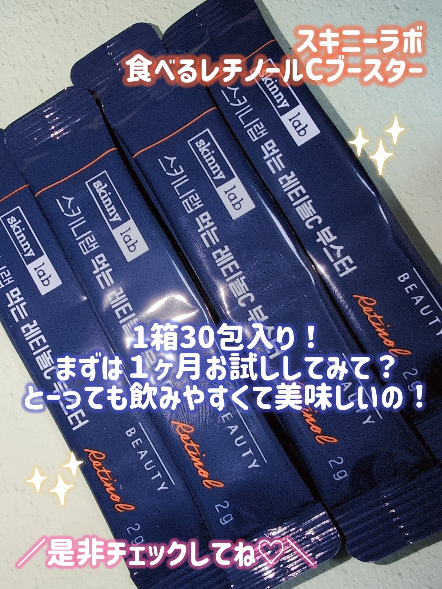 スキニーラボ飲むレチノールCブースター(30包)"しっかりとした自信、1日1包、まぶしい変化の始まり!"これからは塗るのではなく、飲むレチノールで満たしてみて!100%植物性モリンガの葉から抽出したレチノールを配合1日1包でレチノール1,00...