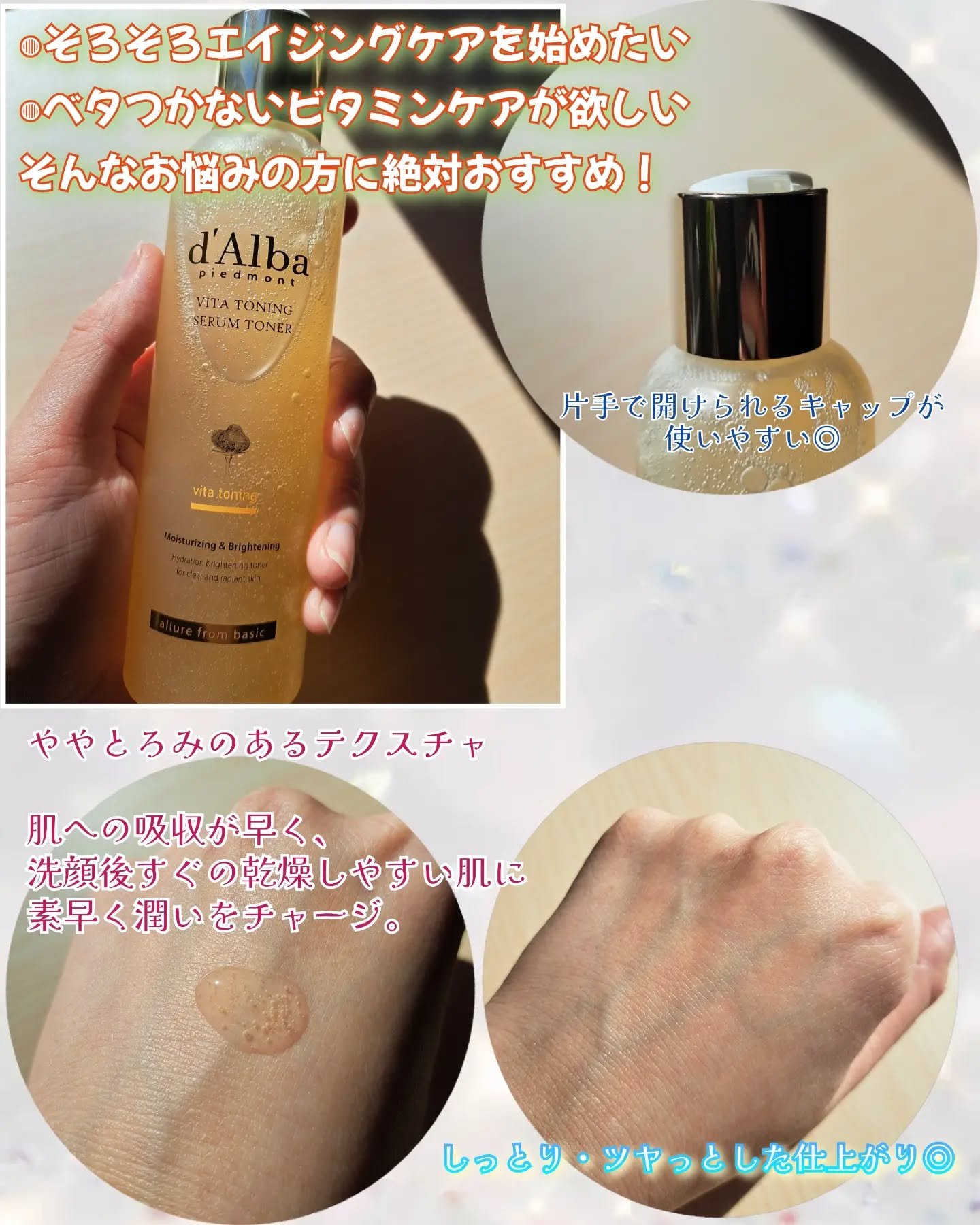 .d'Albaビタトーニングセラムトナー肌キメ・角質・毛穴までALLケア.ᐟ.ᐟくすみケア、肌トーン・ハリケアまで𓈒𓂂𓏸ビタミンツリー水11.76%に、ビタミンC+グルタチオン+ナイアシンアミド2%含有*純度98%のグルタチオンをリポソーム化...